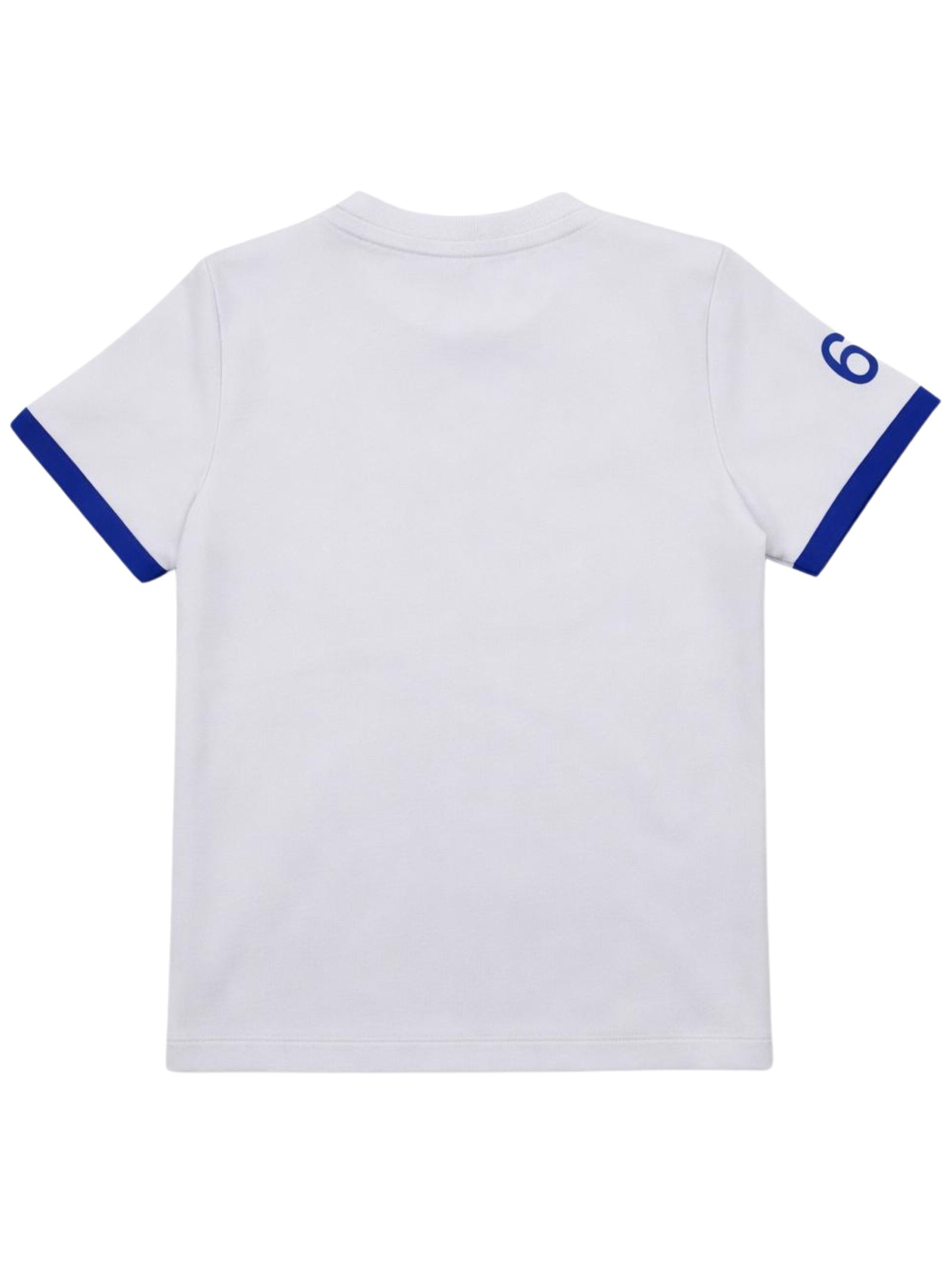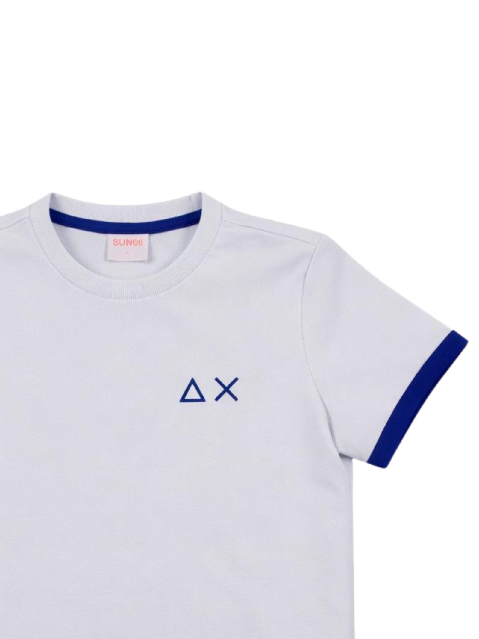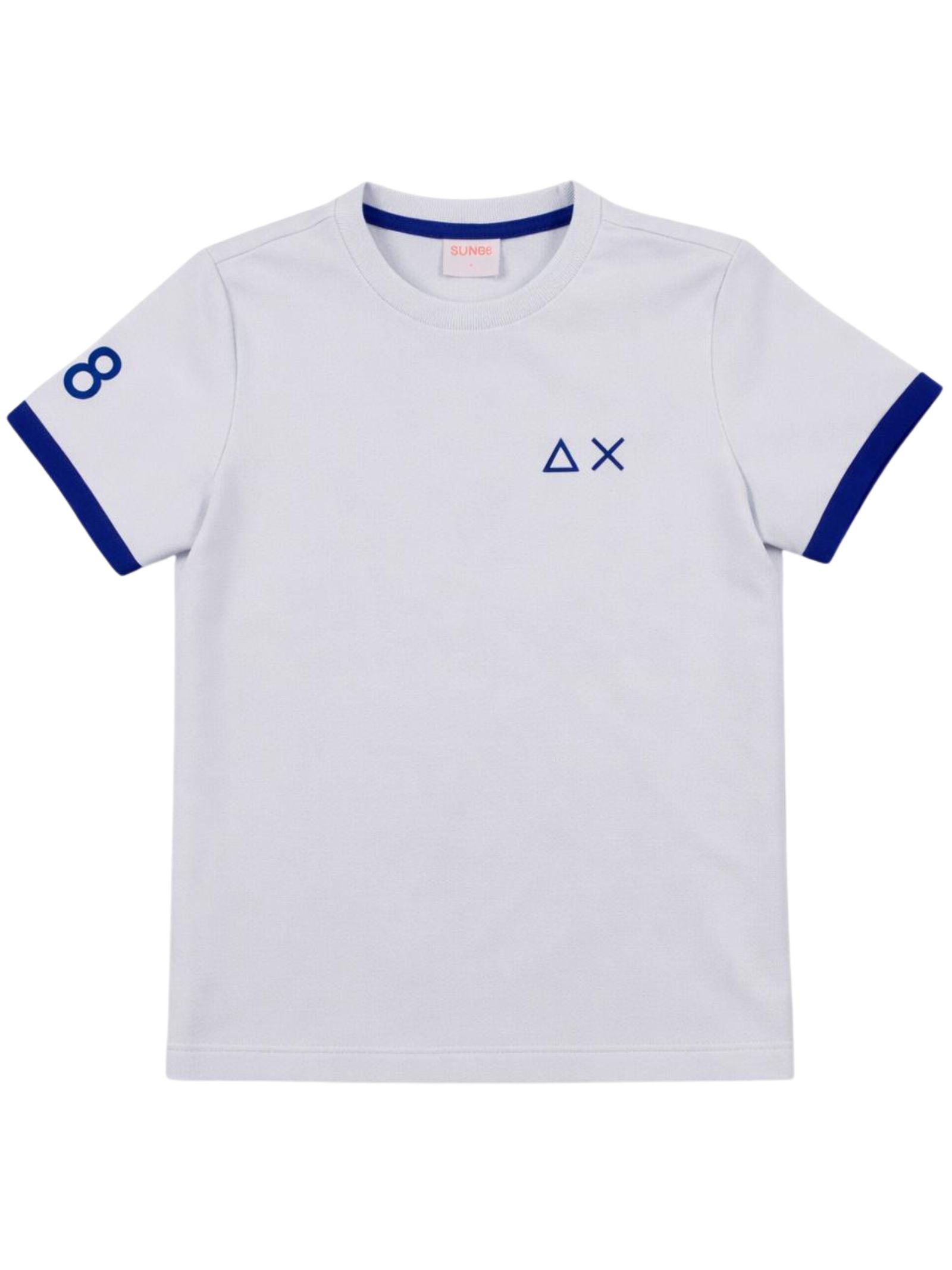 Sun68 Kids t-shirt di colore bianco, realizzata in cotone piquet, dettagli a contrasto blu, modello girocollo, mezza manica, applicazione logo gommato sul braccio, orlo dritto, vestibilità regolare. Composizione: 95% cotone 5% elastan