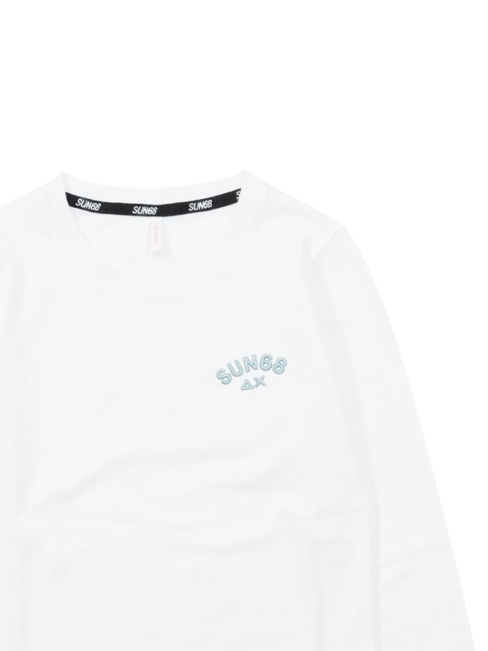 Sun68 Kids t-shirt di colore bianco, modello girocollo, manica lunga, caratterizzata da ricamo logo a contrasto sul petto, vestibilità regolare, orlo dritto. Composizione: 100% cotone