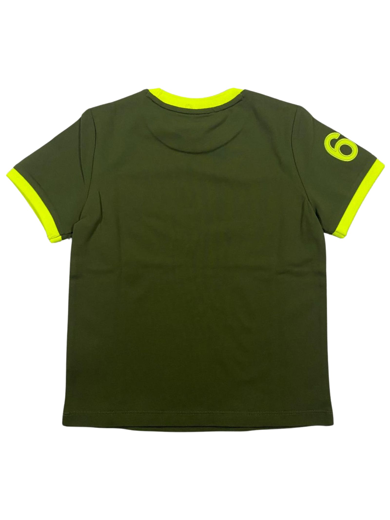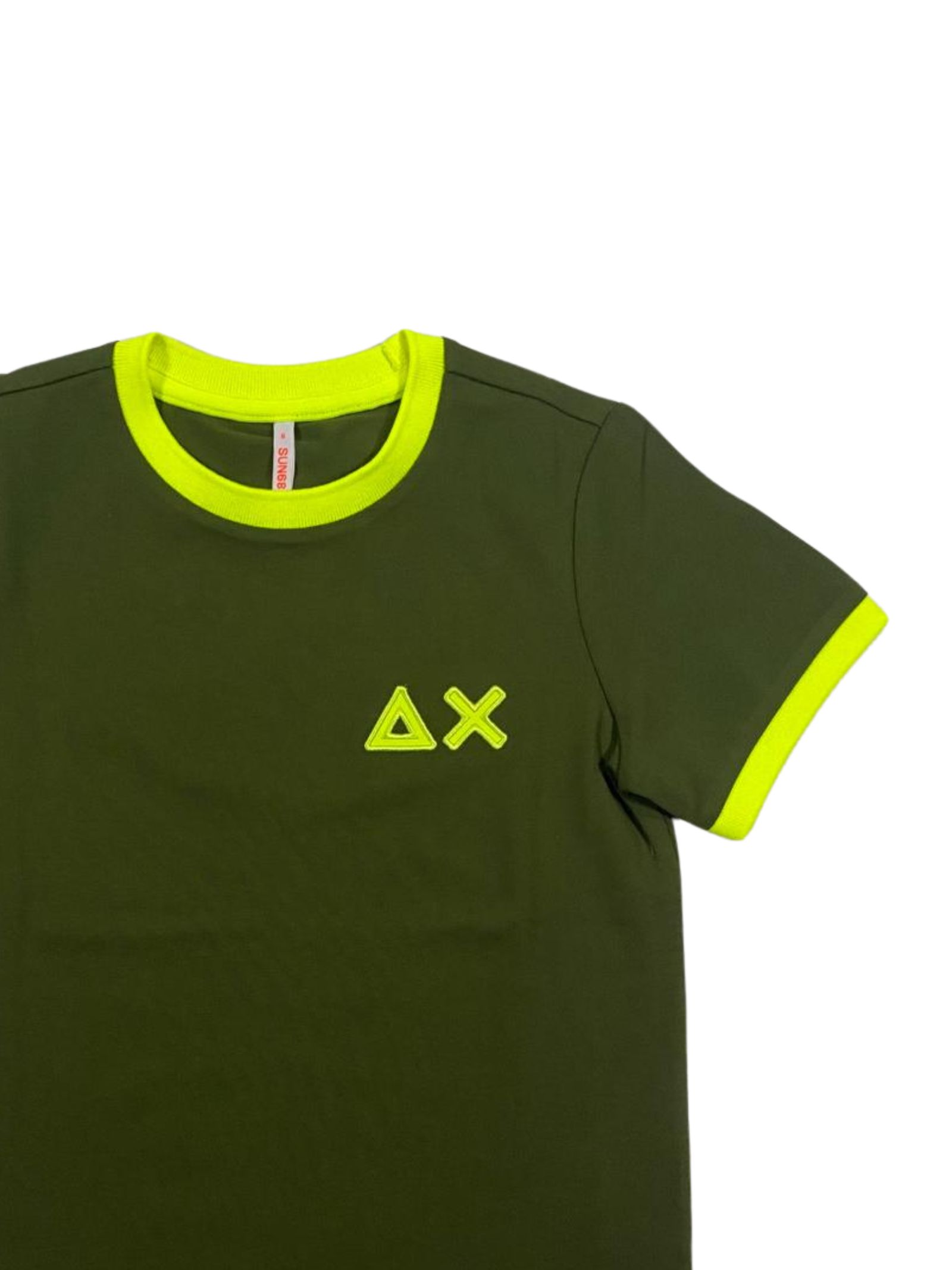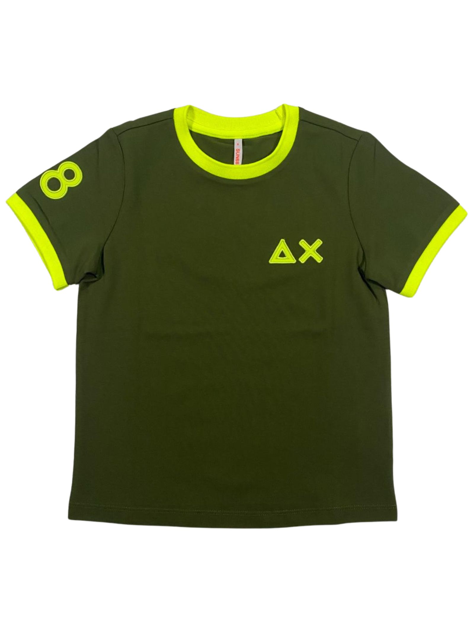 Sun68 Kids t-shirt di colore verde, modello girocollo, mezza manica, caratterizzata da dettagli e ricamo logo a contrasto giallo fluo, orlo dritto, vestibilità regolare. Composizione: 95% cotone 5% elastan