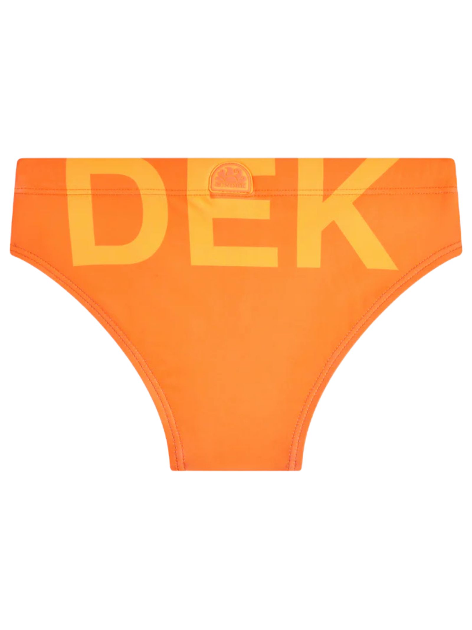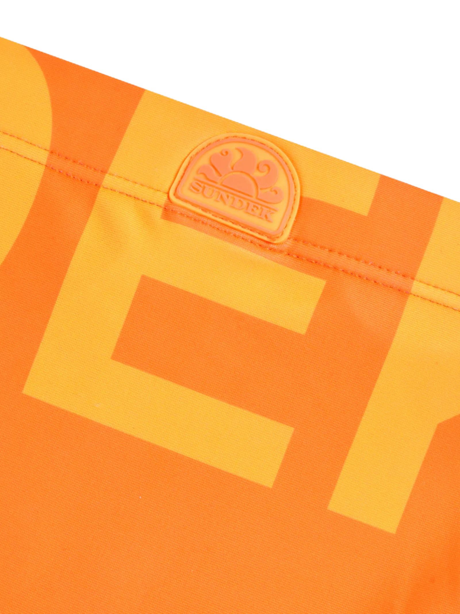 Sundek Kids costume da bagno di colore arancio fluo, stampa logo su entrambi i lati, realizzato in nylon Econyl rigenerato, vita elastica con coulisse, logo applicato. Composizione: 82% poliammide 18% Elastan