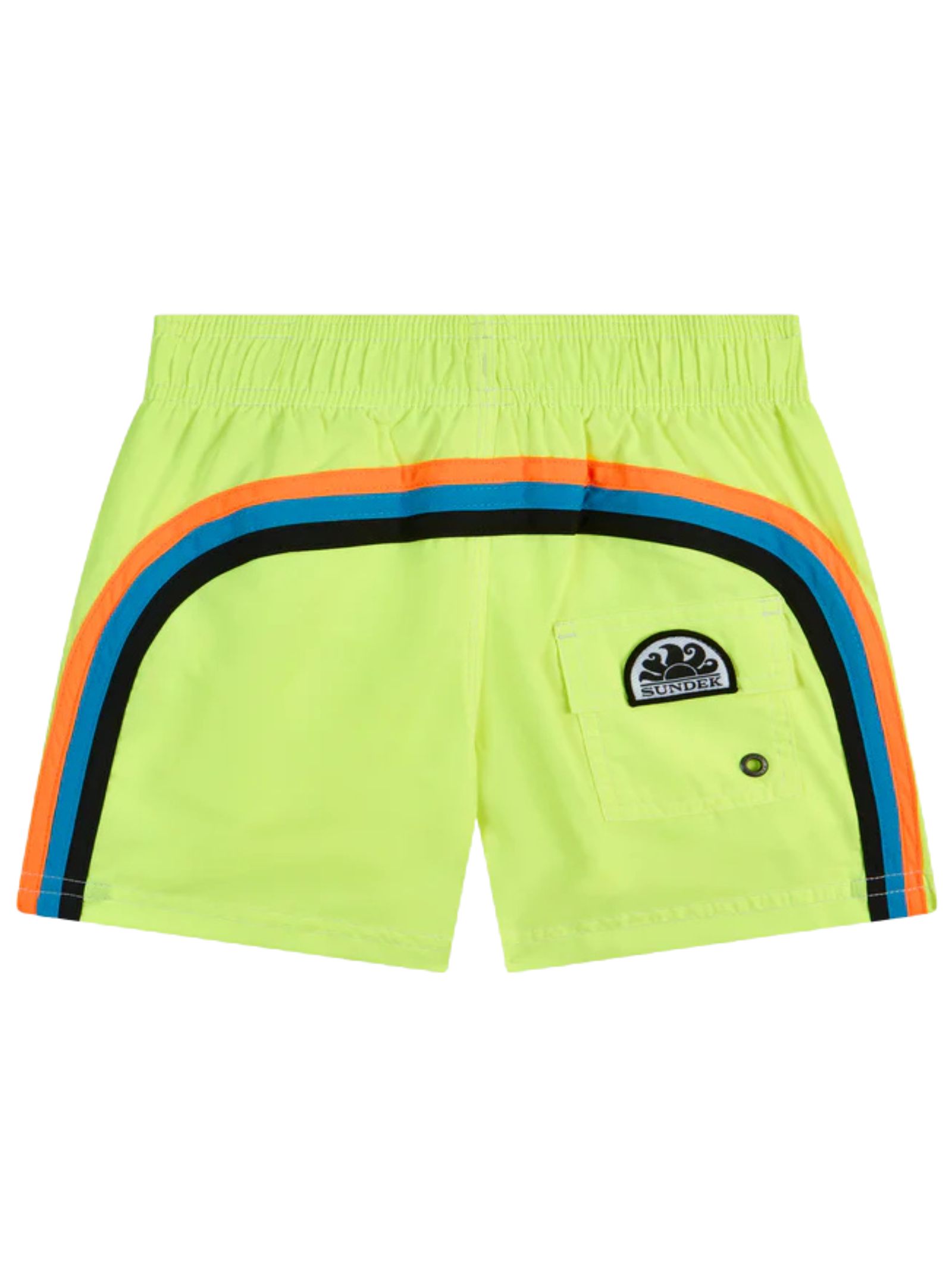 Sundek Kids costume da bagno di colore giallo fluo, caratterizzato dall'inconfondibile arcobaleno multicolor sul retro, tessuto leggero, asciugatura rapida, fodera in rete, slip interno, elastico in vita con coulisse, tasche ai lati, logo sul retro. Composizione: 100% poliestere