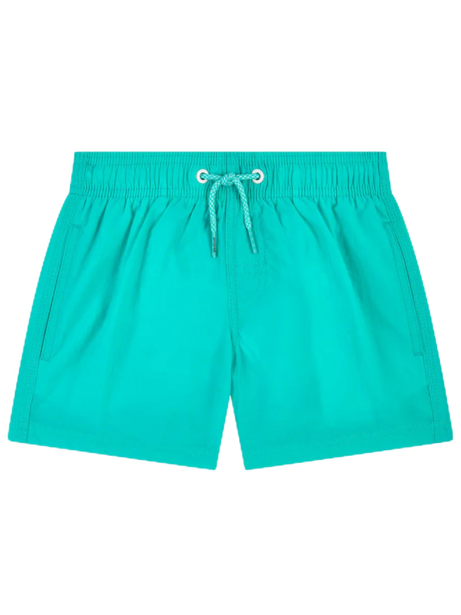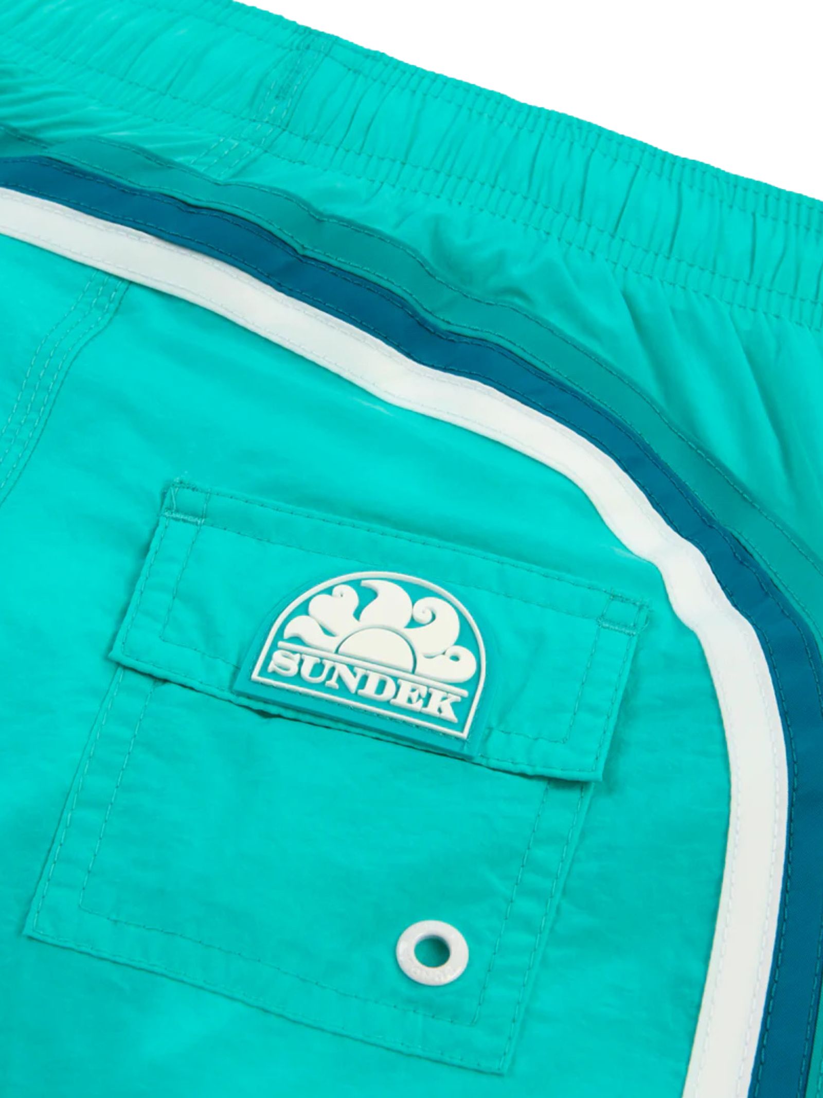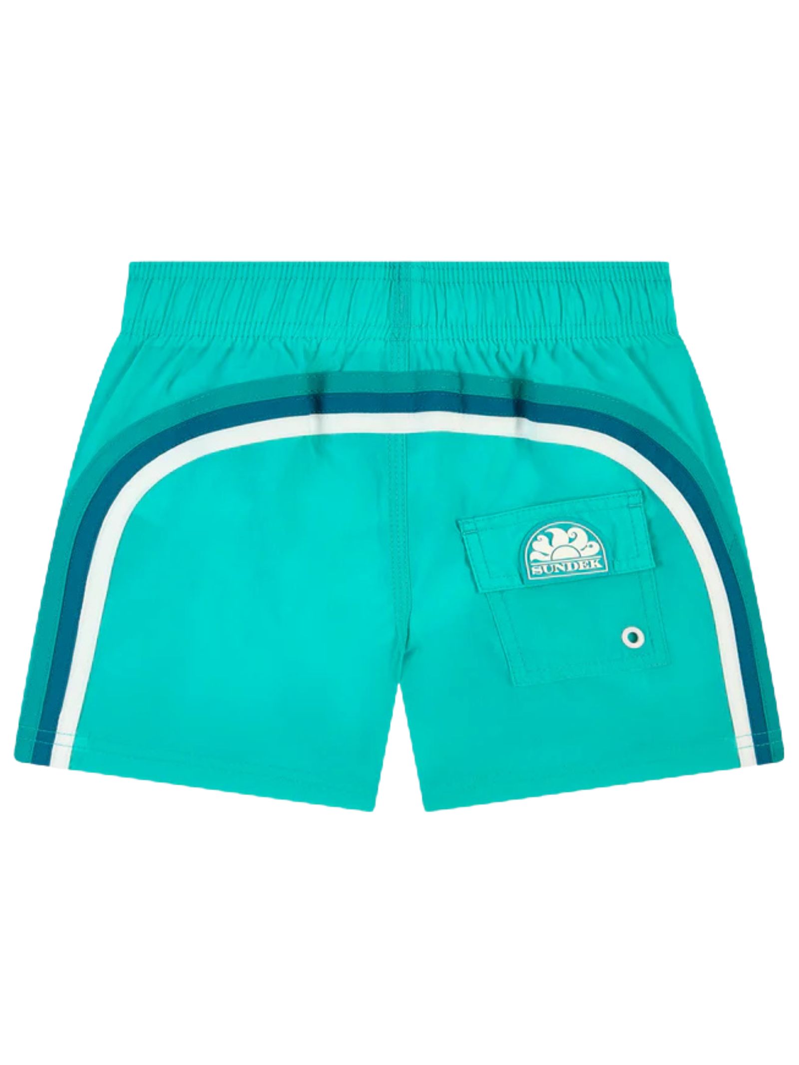 Sundek Kids t-shirt di colore verde acqua, caratterizzato dall'inconfondibile arcobaleno multicolor sul retro, tessuto leggero, asciugatura rapida, fodera in rete, slip interno, elastico in vita con coulisse, tasche ai lati, tasca con logo sul retro. 100% poliestere
