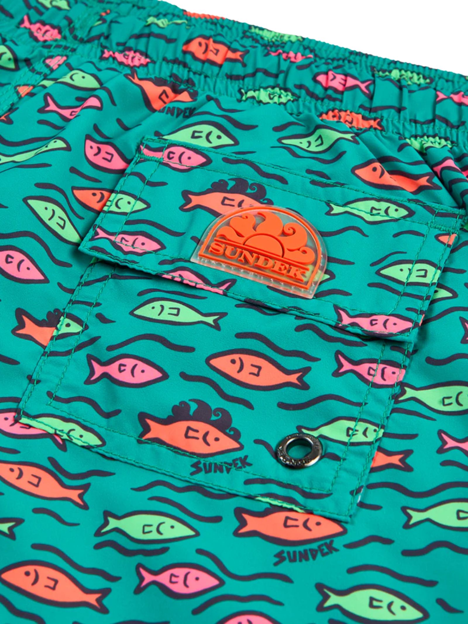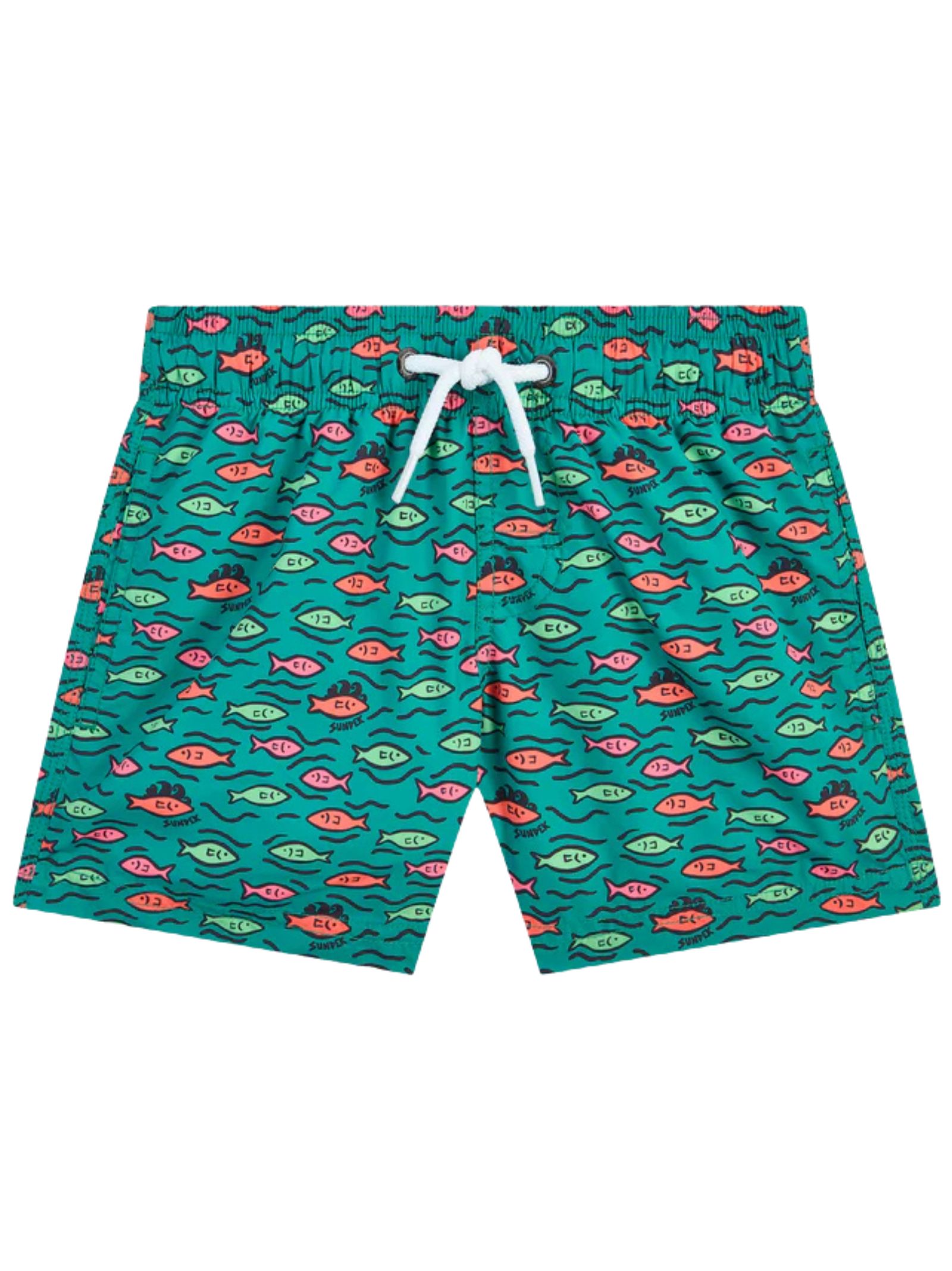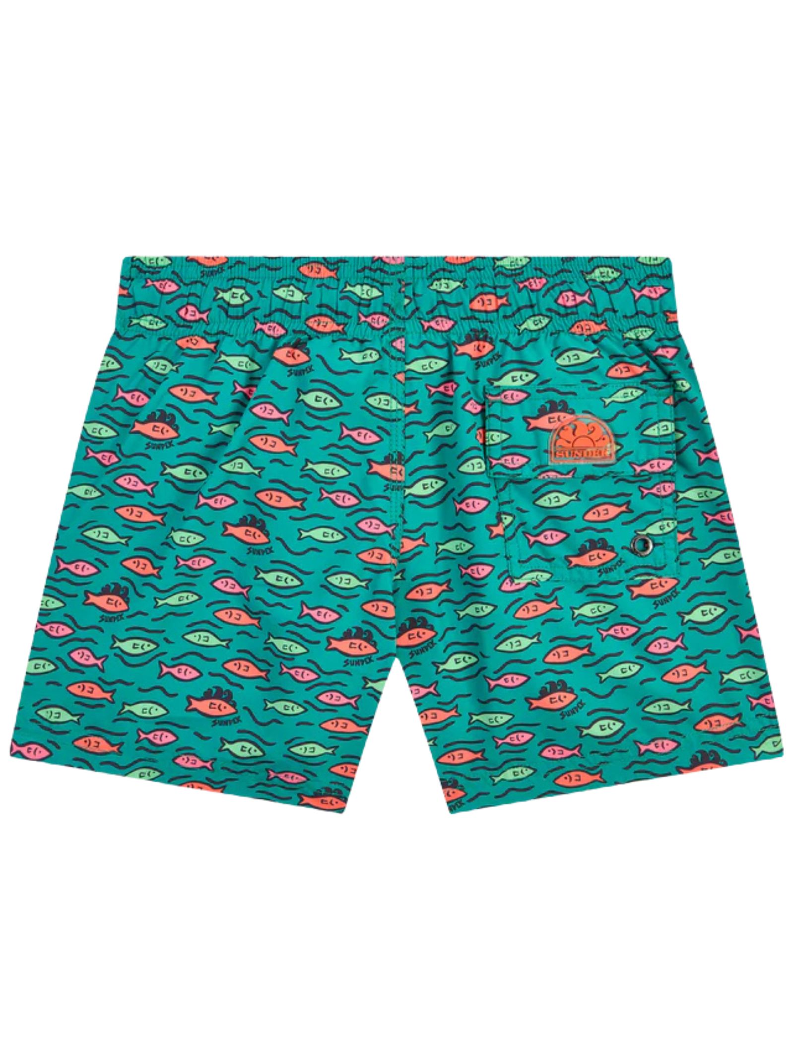 Sundek Kids costume da bagno di colore verde acqua in fantasia pesci multicolor all-over, tessuto leggero, asciugatura rapida, fodera in rete, slip interno, elastico in vita con coulisse, tasche ai lati, logo sul retro. Composizione: 100% poliestere