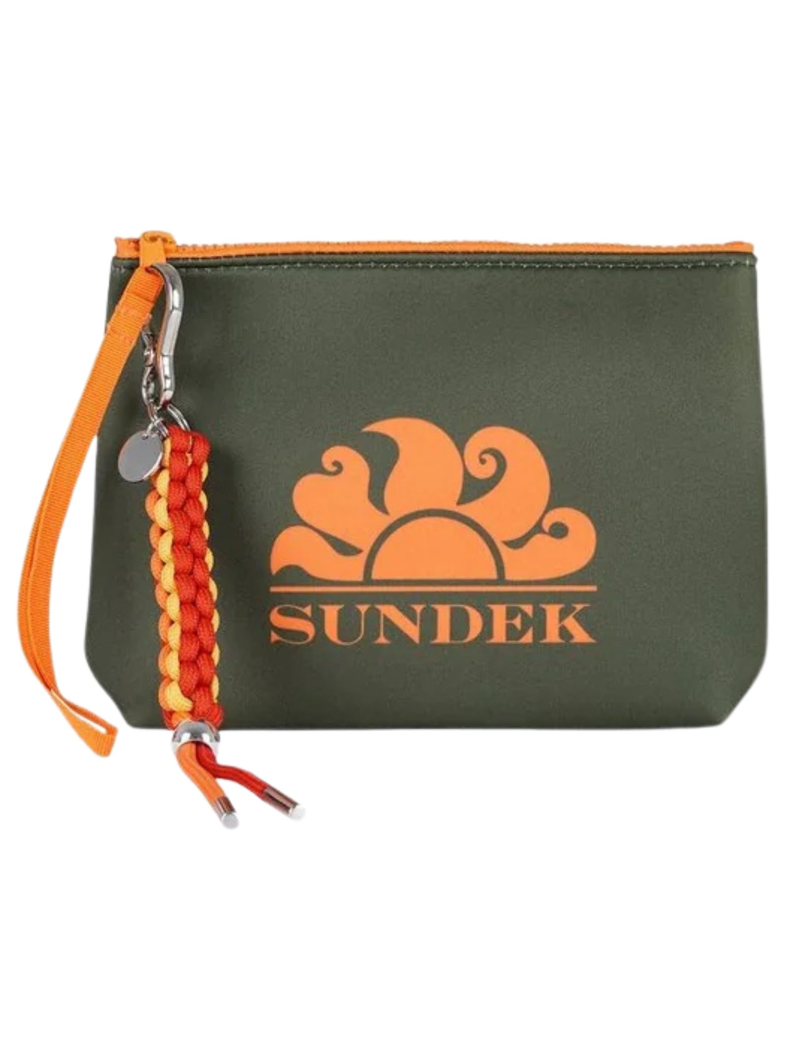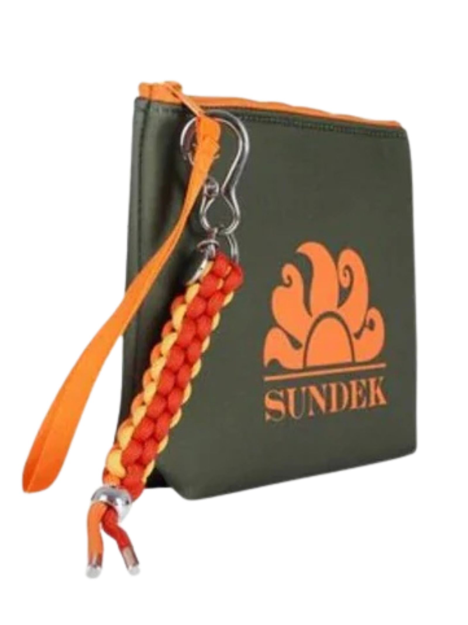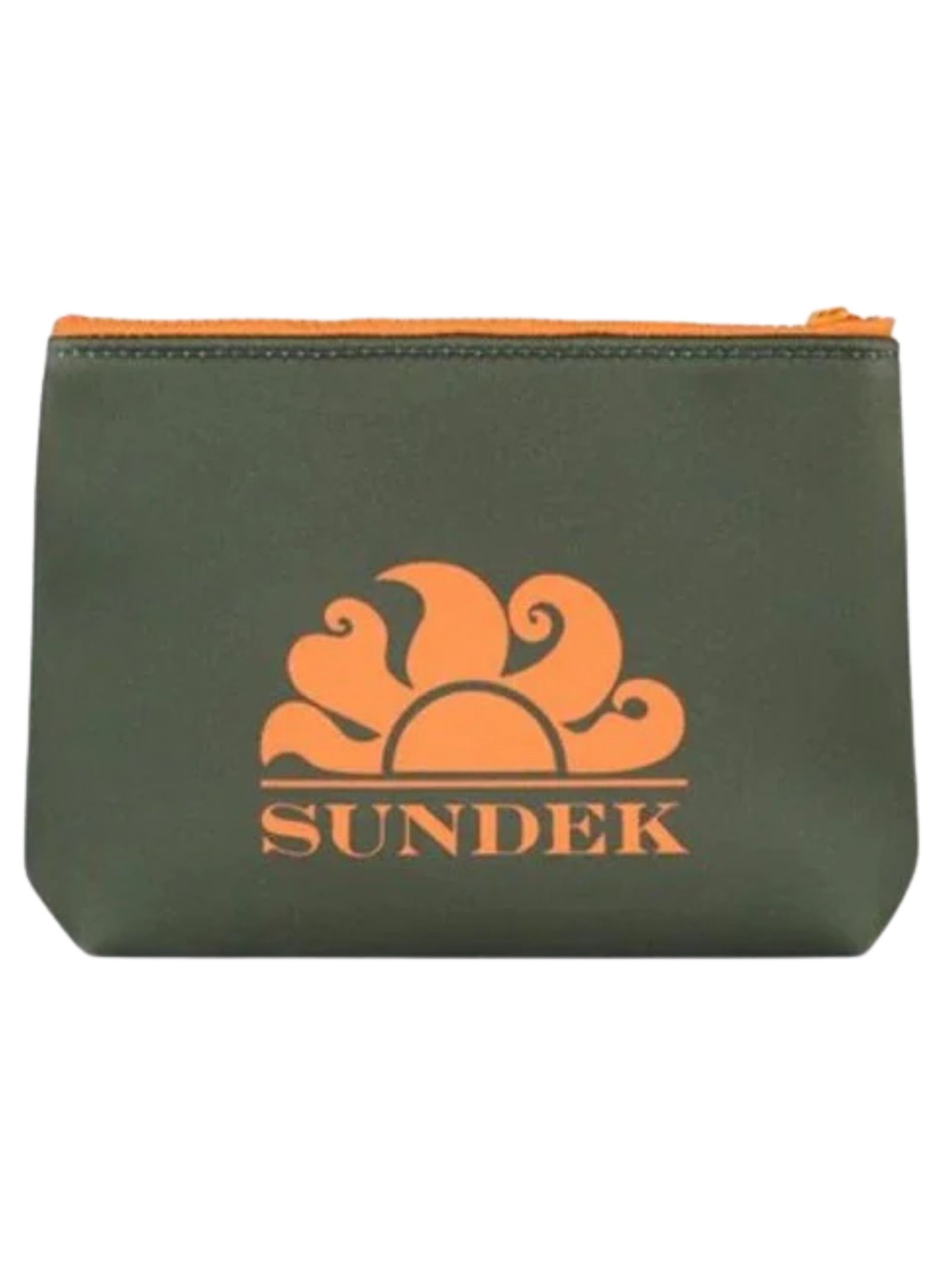 Sundek Kids pochette di colore verde, realizzata in tessuto scooba, maxi logo sul davanti a contrasto arancio, chiusura con la zip, portachiavi staccabile. Dimensoni: 23cm x 16cm. Composizione: 90% gomma 10% poliestere