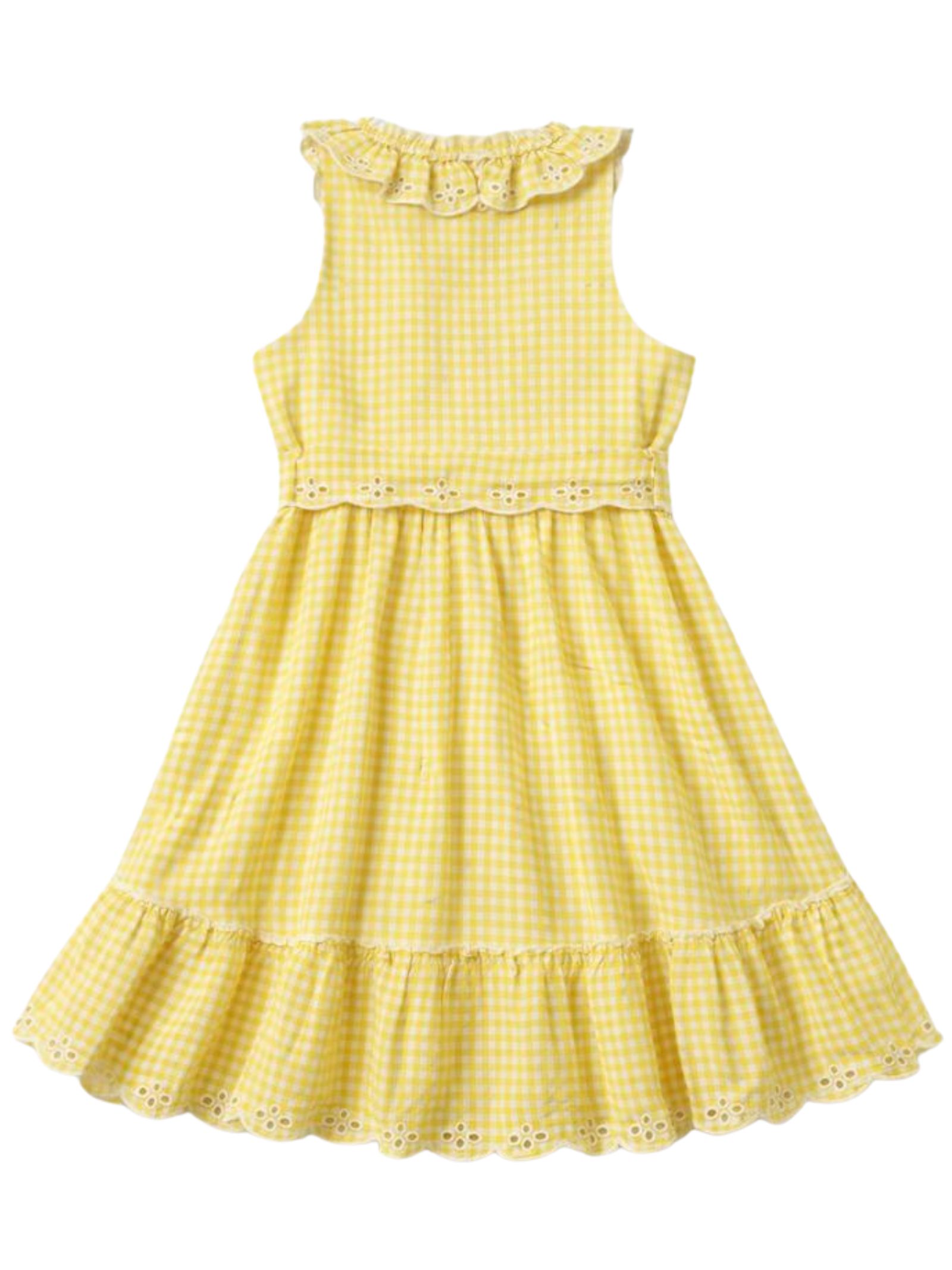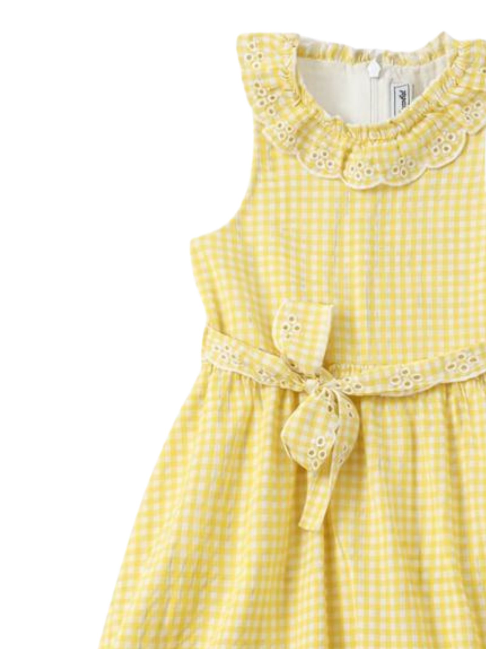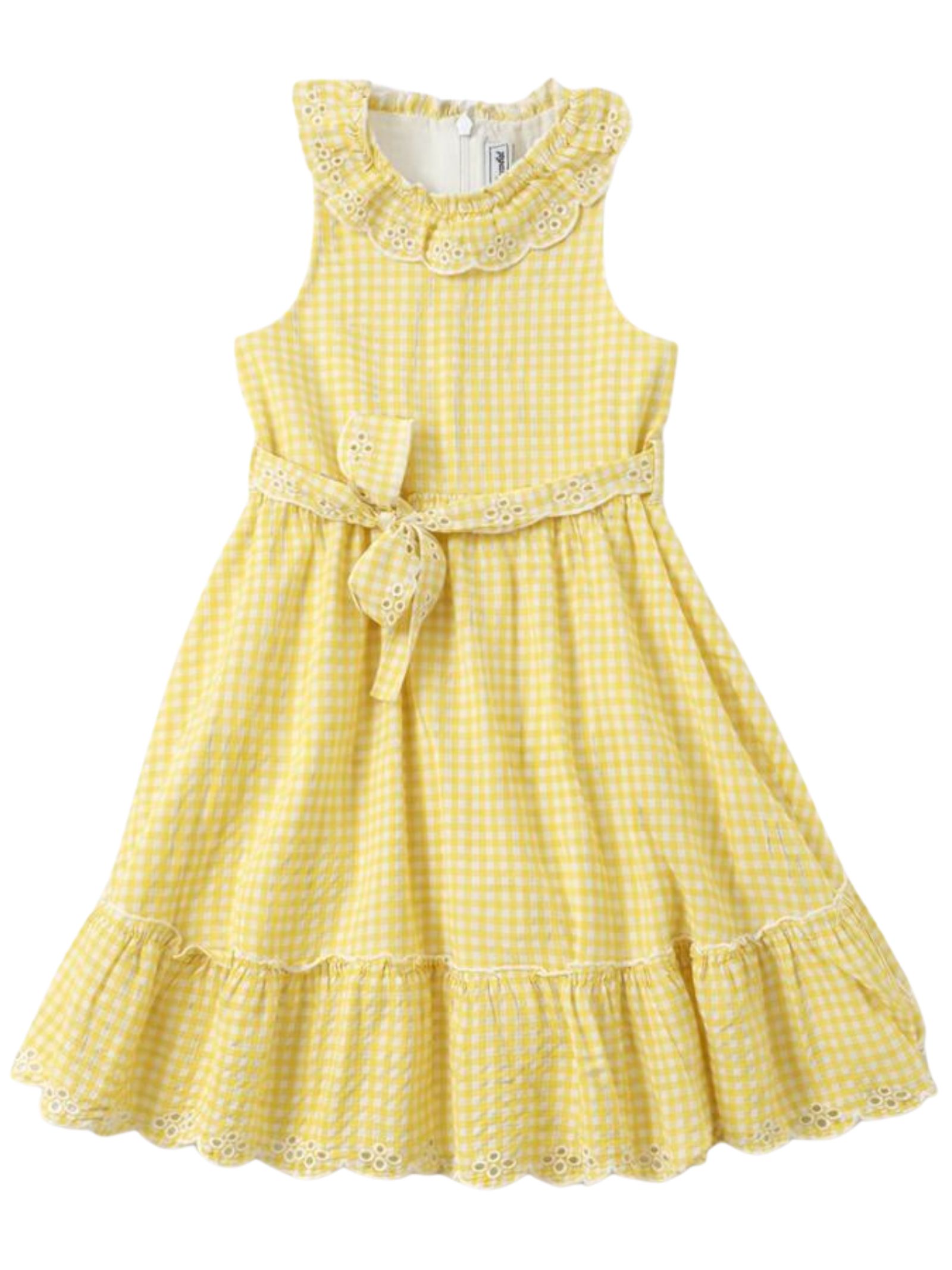 Tartine et Chocolat Kids abito realizzato in cotone di colore giallo in fantasia a quadretti, modello girocollo con volant, giro manica, cintura abbinata, design svasato con volant, fodera in cotone, zip sul retro. Composizione: 62% cotone 37% poliestere 1% elastan