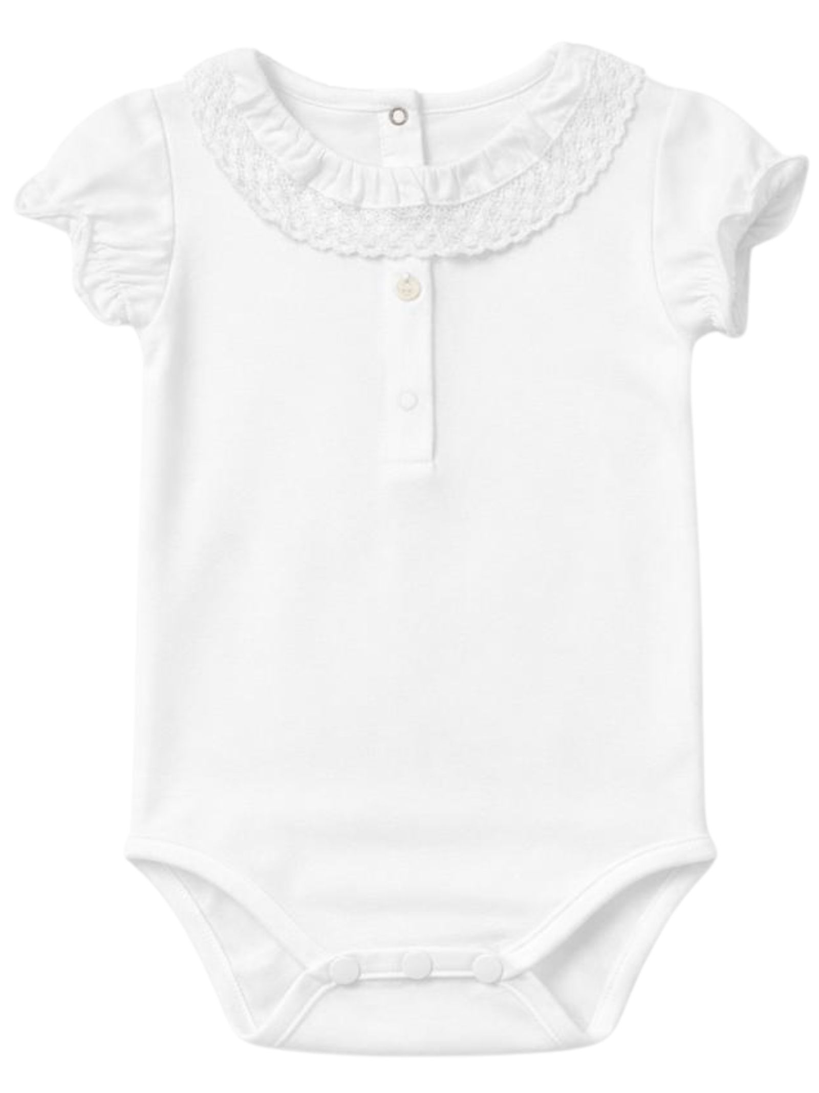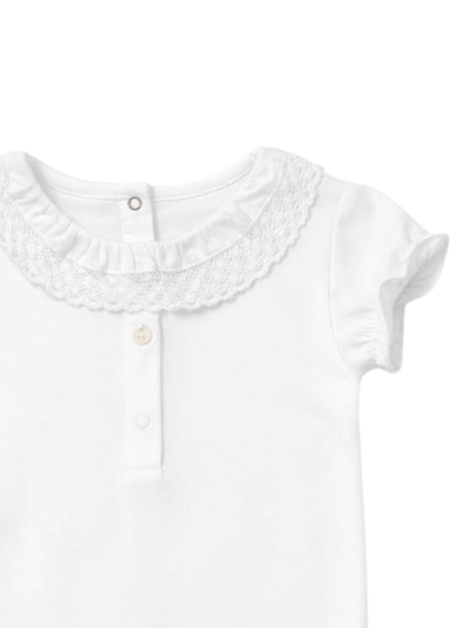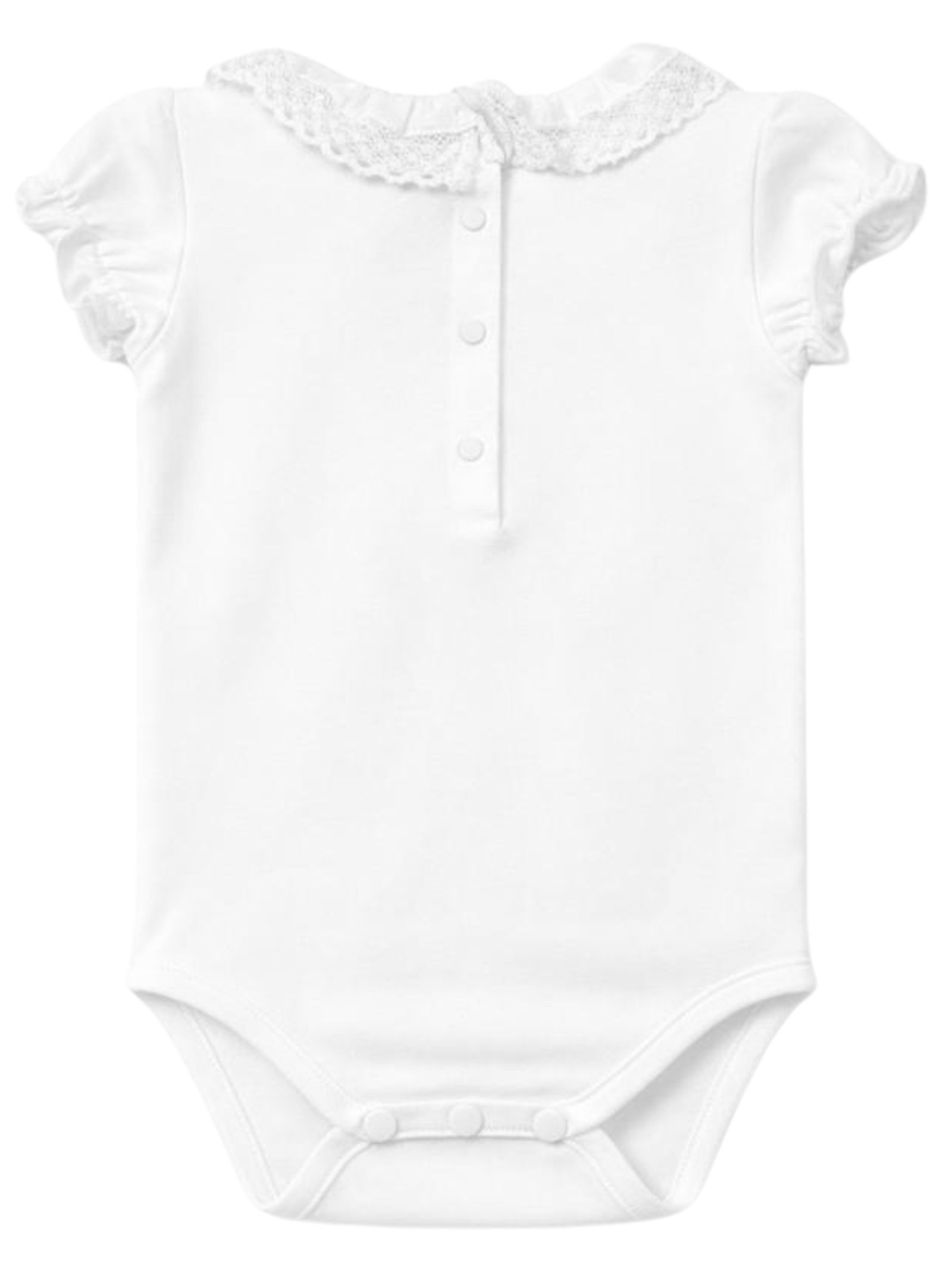 Tartine et Chocolat Kids body di colore bianco realizzato in cotone, design girocollo con volant in pizzo, mezza manica a sbuffo, apertura con bottoni sul retro e sul cavallo. Composizione: 100% cotone