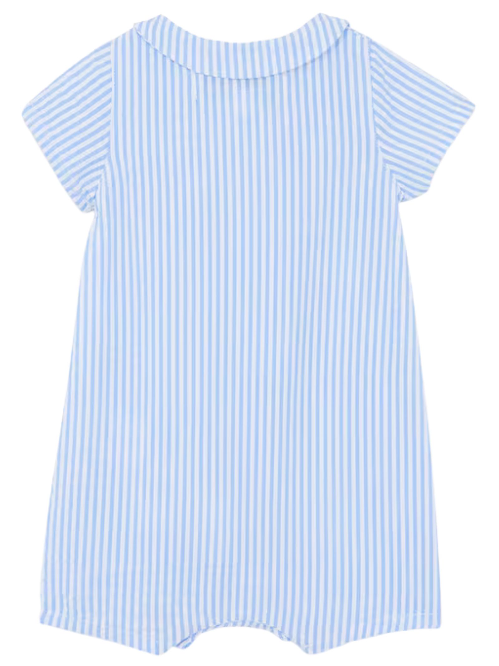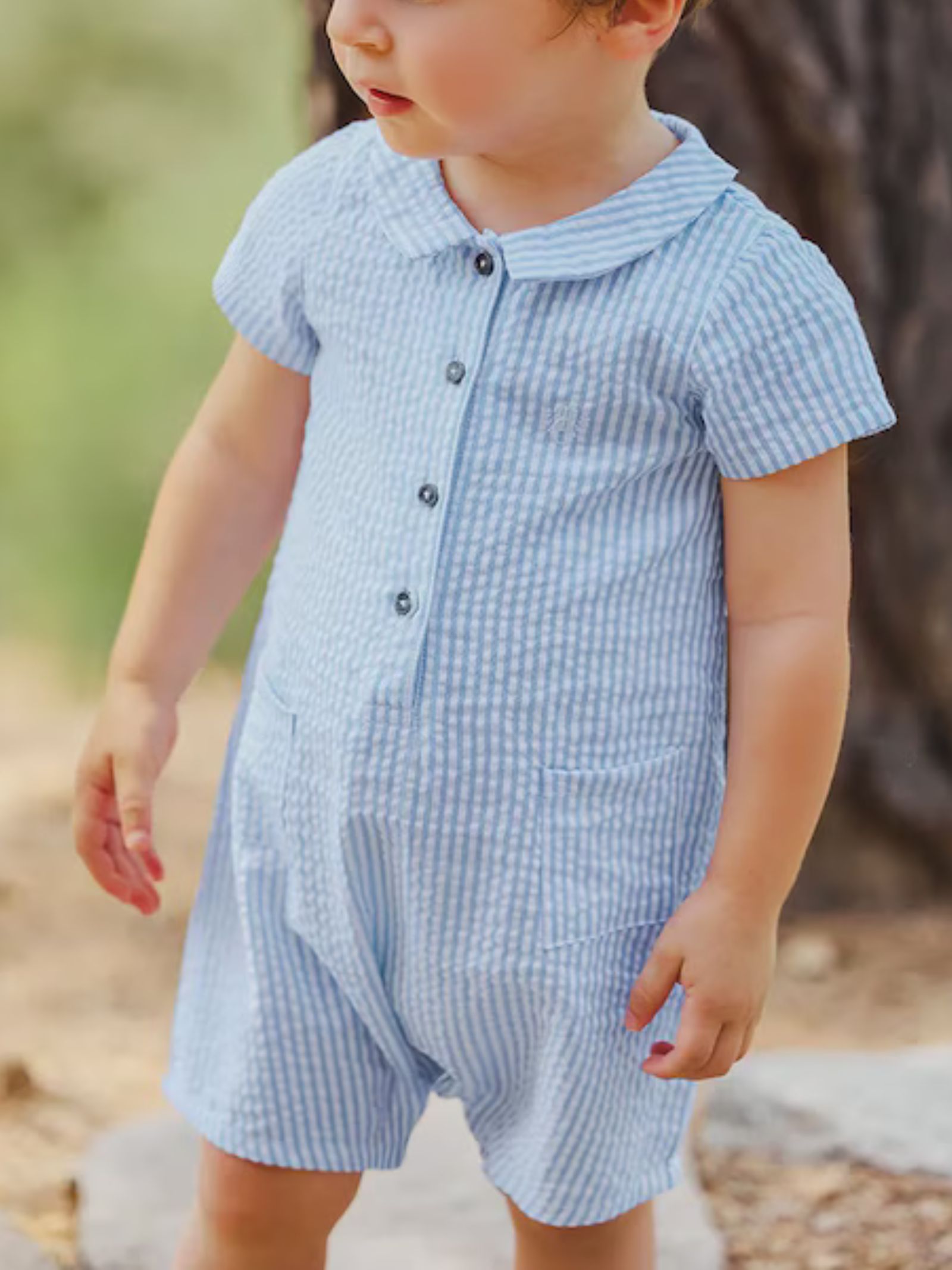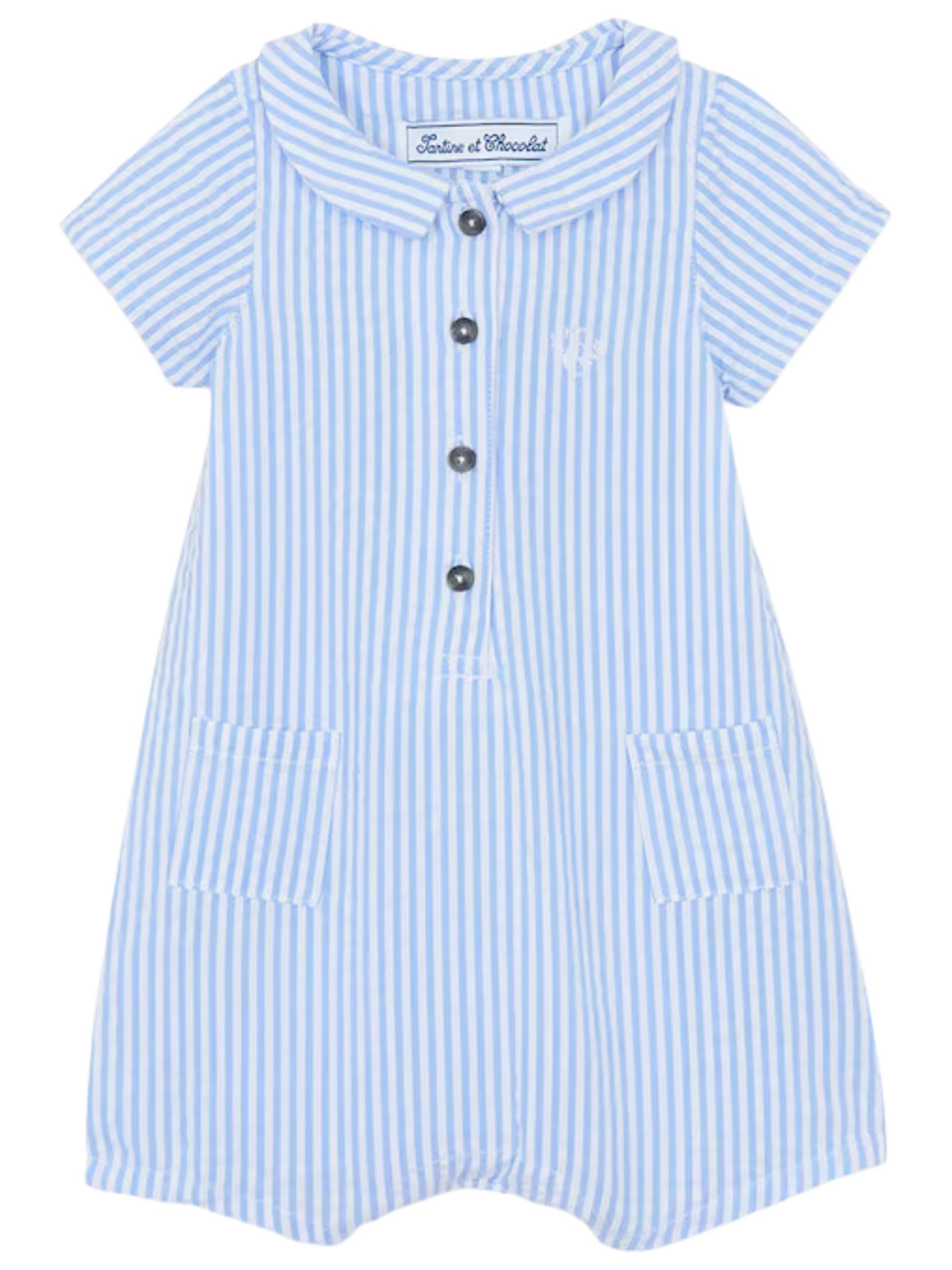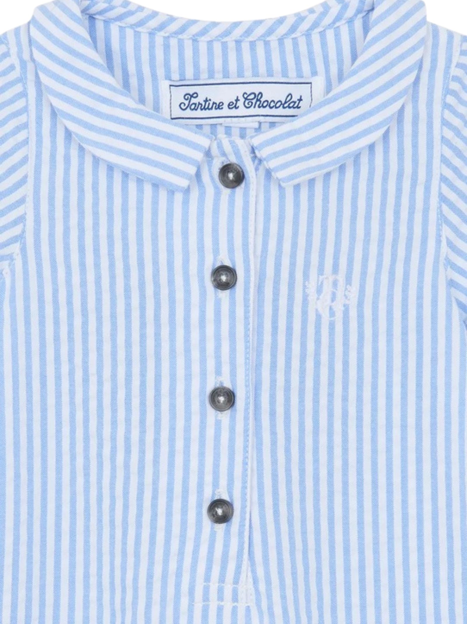 Tartine et Chocolat Kids pagliaccetto di colore azzurro, fantasia a righini, mezza manica, apertura con bottoni a pressione sul cavallo. Composizione: 100% cotone