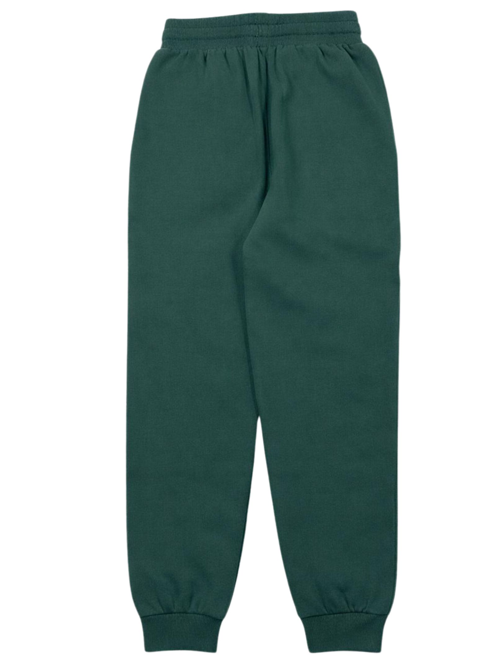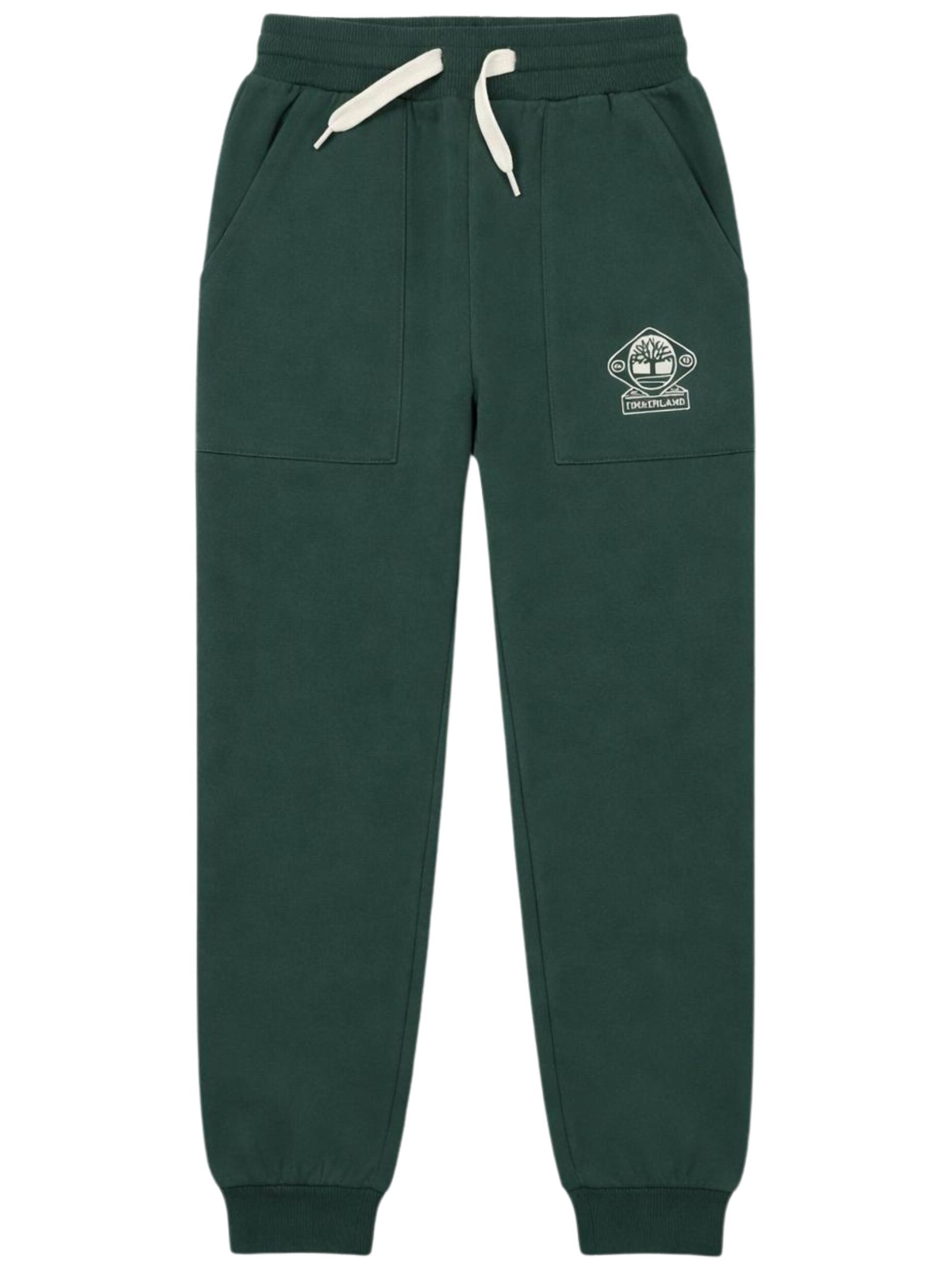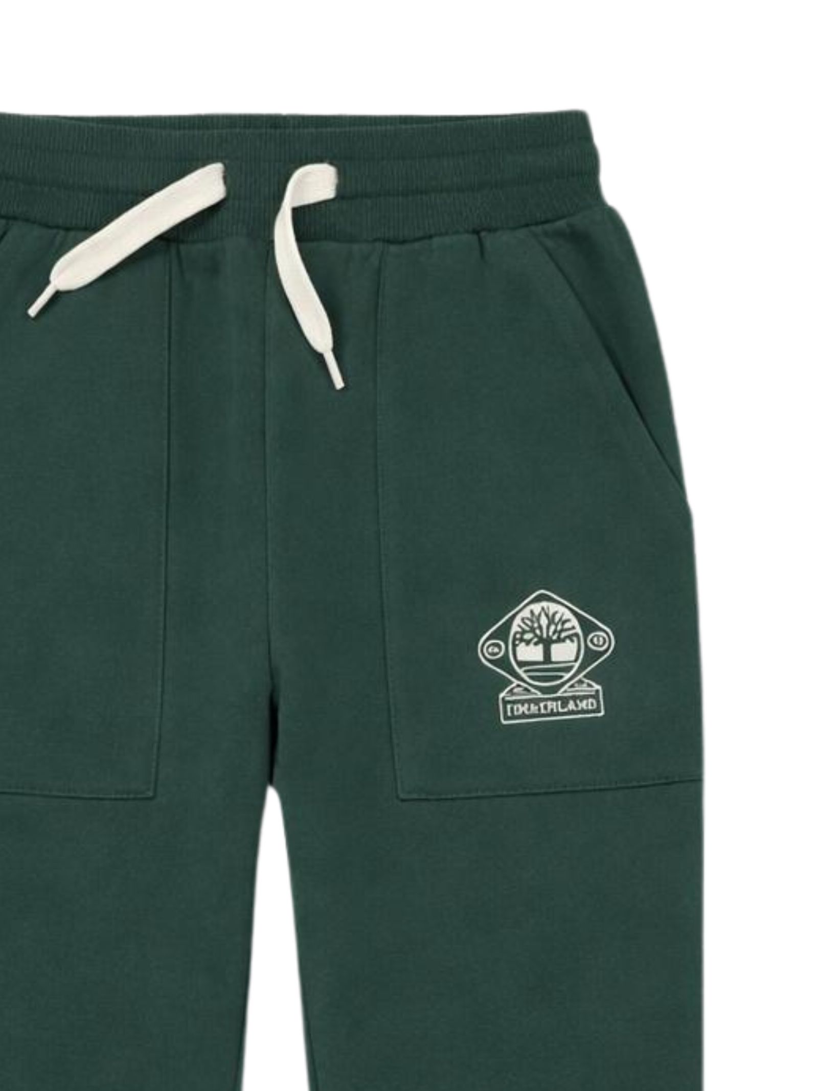 Timberland Kids pantalone di colore verde, modello con elastico in vita e coulisse, due tasche laterali, stampa logo a contrasto, orli a costine, caviglie con elastico, vestibilità regolare. Composizione: 80% cotone caldo 20% poliestere