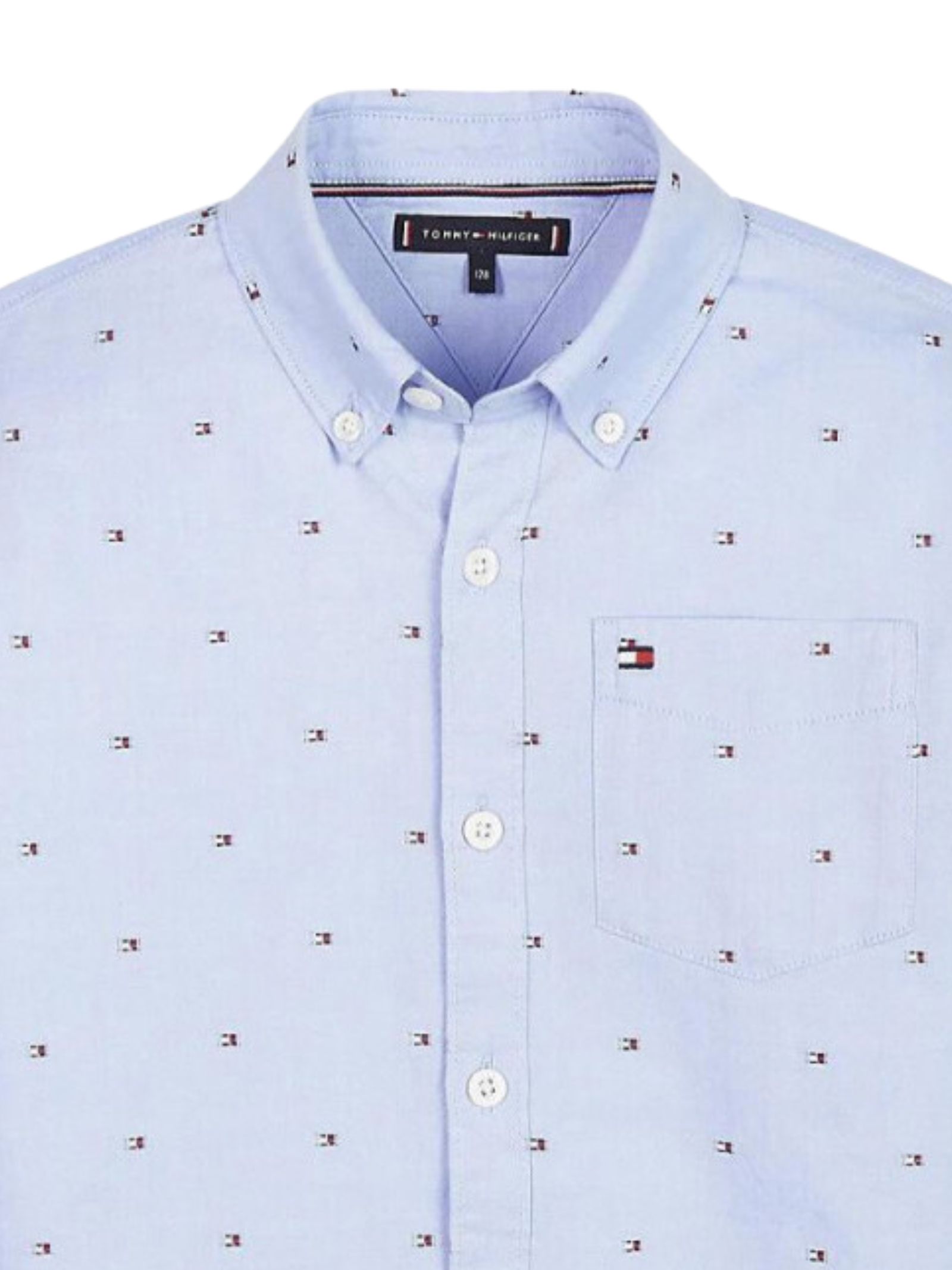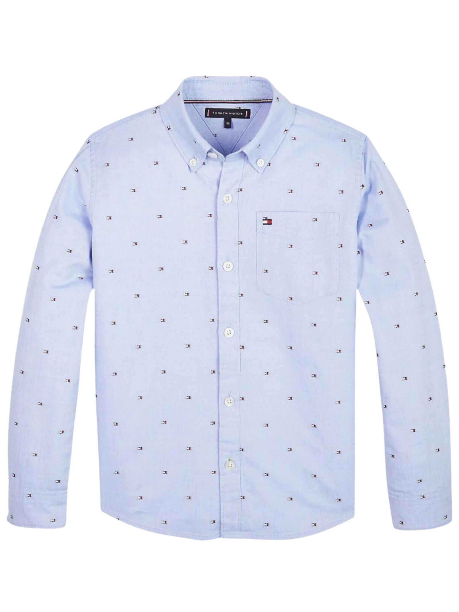 Tommy Hilfiger Kids camicia di colore azzurro, ricamo a contrasto all-over, colletto classico, manica lunga, taschino sul petto con ricamo logo, vestibilità regolare. Composizione: 100% cotone