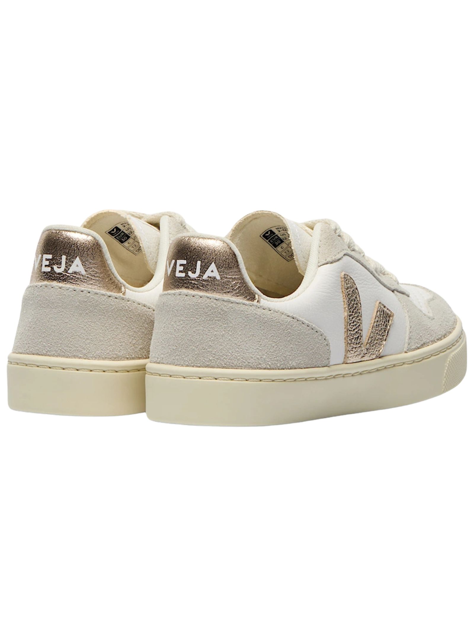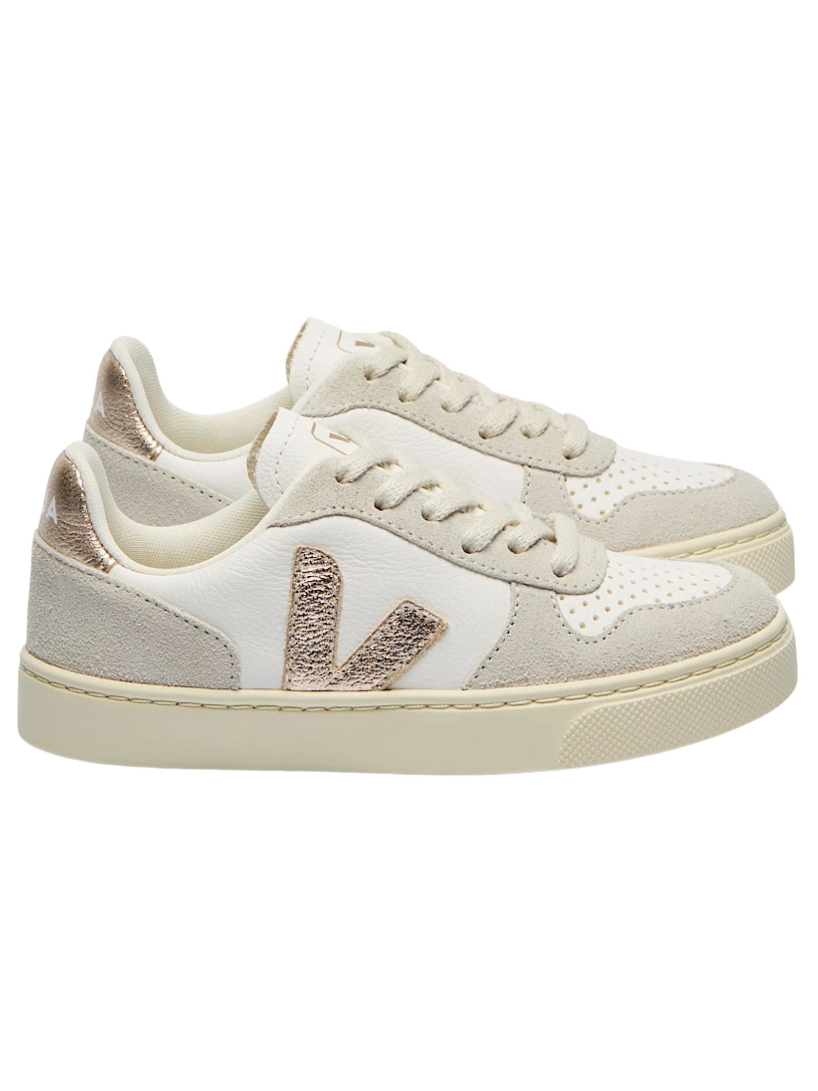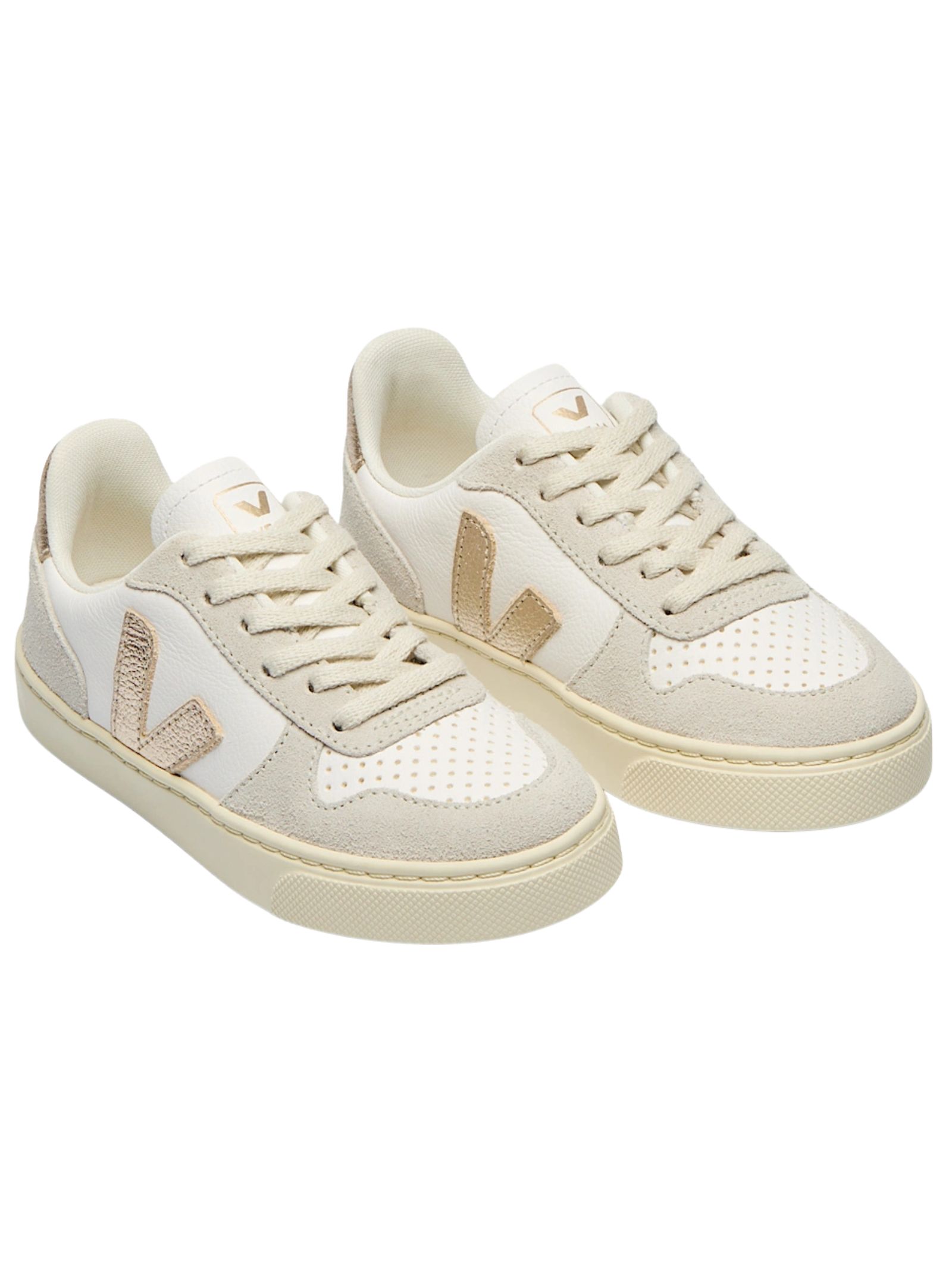 VEJA Kids scarpe in pelle ChromeFree® di colore bianco/oro, design con punta tonda, inserti in pelle scamosciata a contrasto beige, punta traforata, linguetta con logo stampato, logo laterale, rinforzo sul tallone a contrasto, soletta con logo, suola piatta in gomma e chiusura frontale con lacci. Suola: gomma 100% Fodera: tessuto 100% Esterno: pelle di vitello 100%