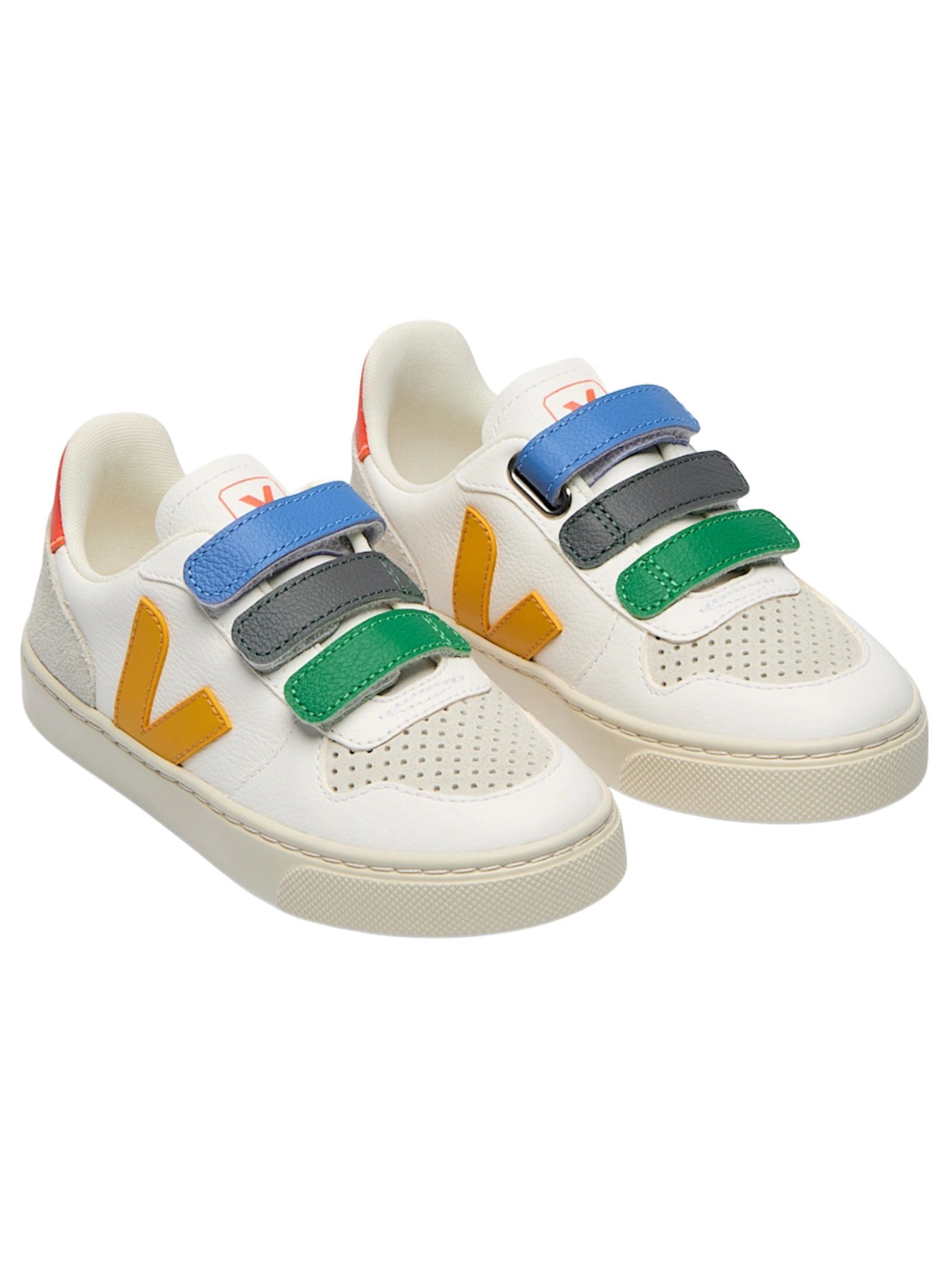 VEJA Kids scarpe VEJA V-10 in pelle ChromeFree® di colore bianco/multicolor, design con punta tonda, inserti in pelle scamosciata, punta traforata, linguetta con logo stampato, logo laterale, rinforzo sul tallone a contrasto, soletta con logo, suola piatta in gomma e chiusura frontale con strappi. Suola: gomma 100% Fodera: tessuto 100% Esterno: pelle di vitello 100%