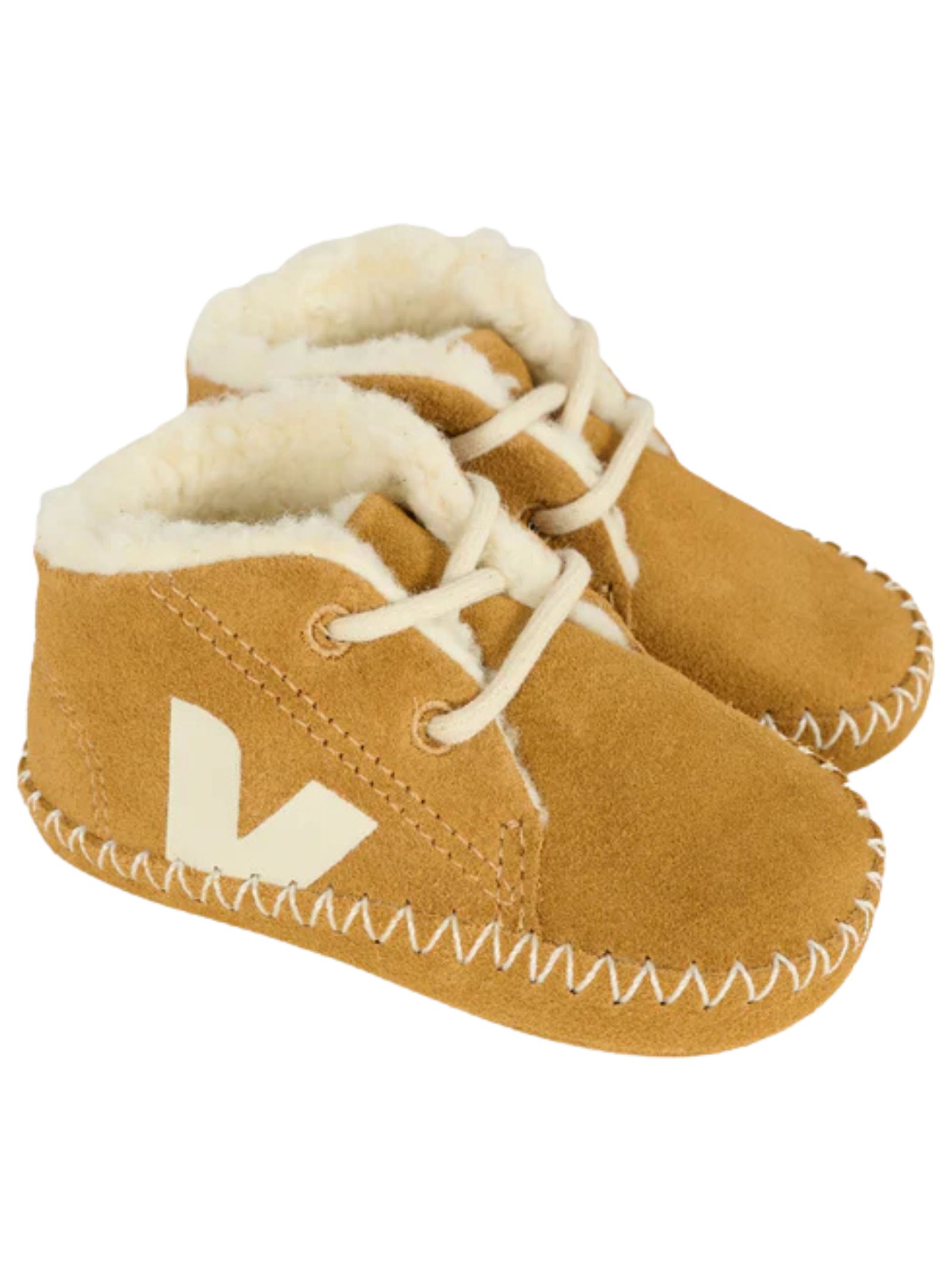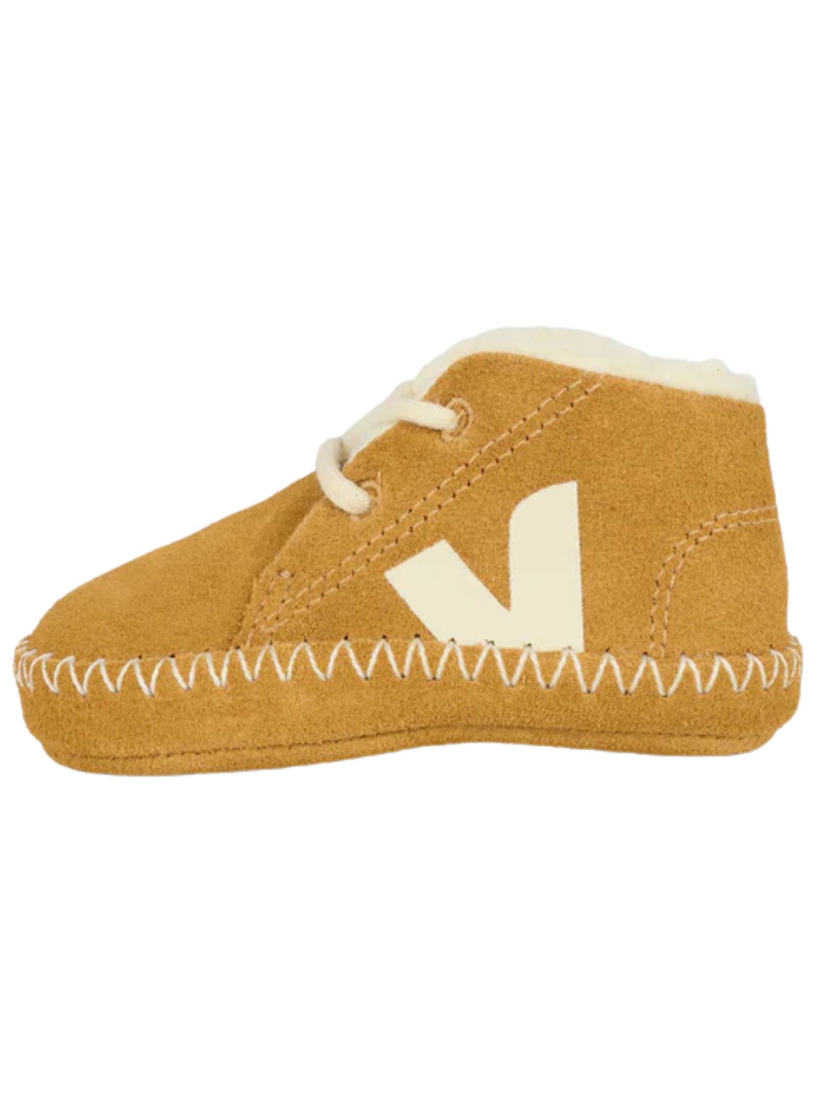 VEJA Kids scarpine pre-walker color cammello, realizzate in pelle scamosciata con interno in morbido shearling ecologico, lacci e punta tonda, decorate con logo bianco laterale. Composizione: 100% pelle scamosciata
