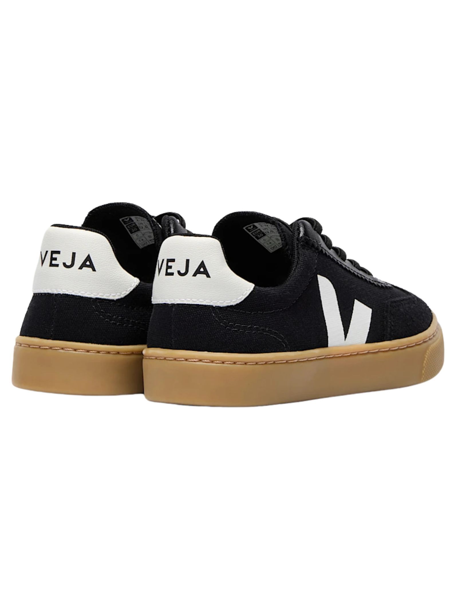 VEJA Kids scarpe SMALL VOLLEY CANVAS di colore nero, design con punta tonda, inserti in pelle scamosciata, linguetta con logo stampato, logo laterale, rinforzo sul tallone a contrasto, soletta con logo, suola piatta in gomma e chiusura frontale con lacci. Suola: gomma 100% Fodera: tessuto 100% Esterno: pelle di vitello 100%