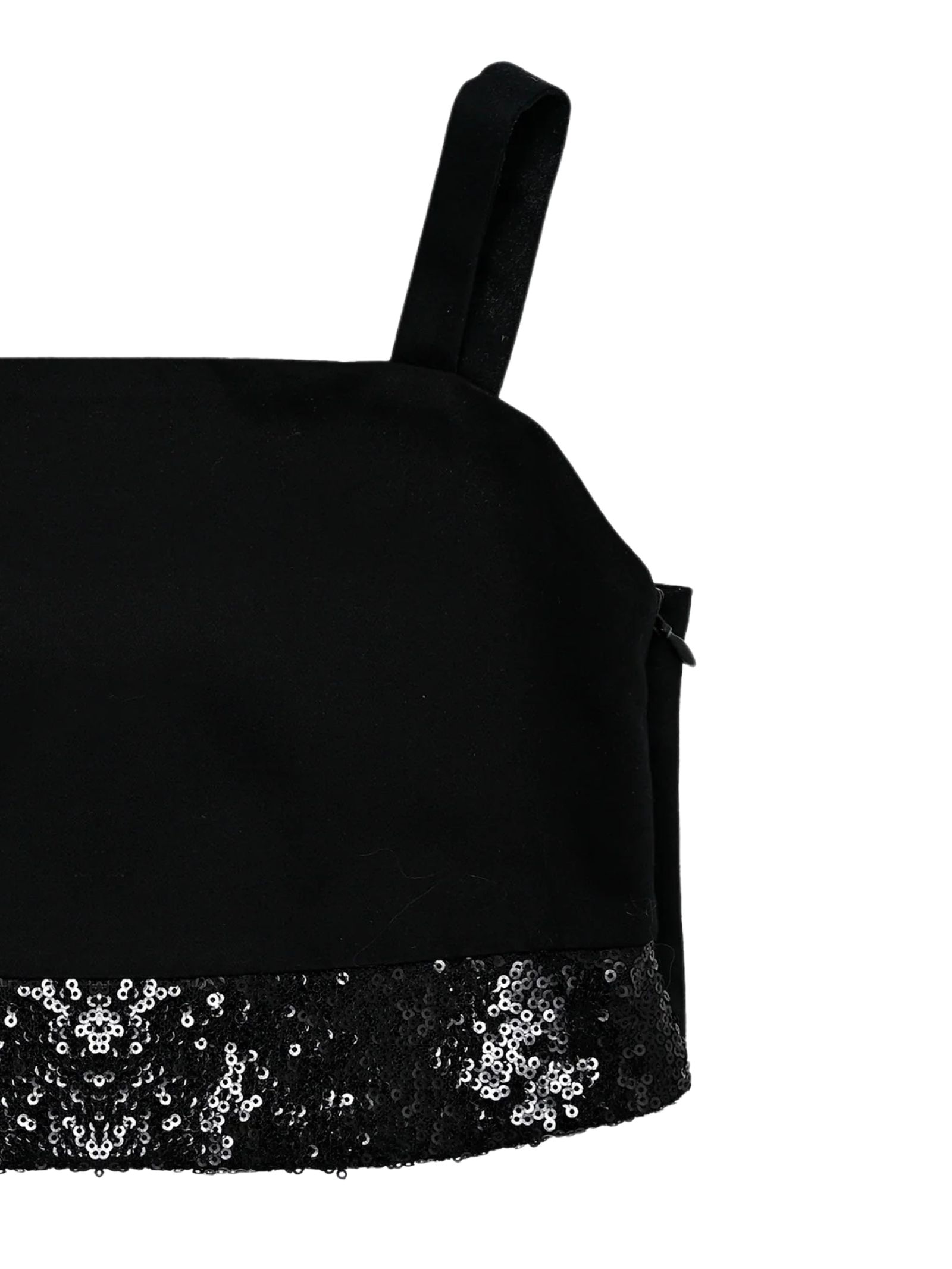 Vicolo Kids top di colore nero, applicazione paillettes, design cropped, bretelle, elastico sul retro, zip laterale. Composizione: 98% poliestere 2% elastan. Made in Italy