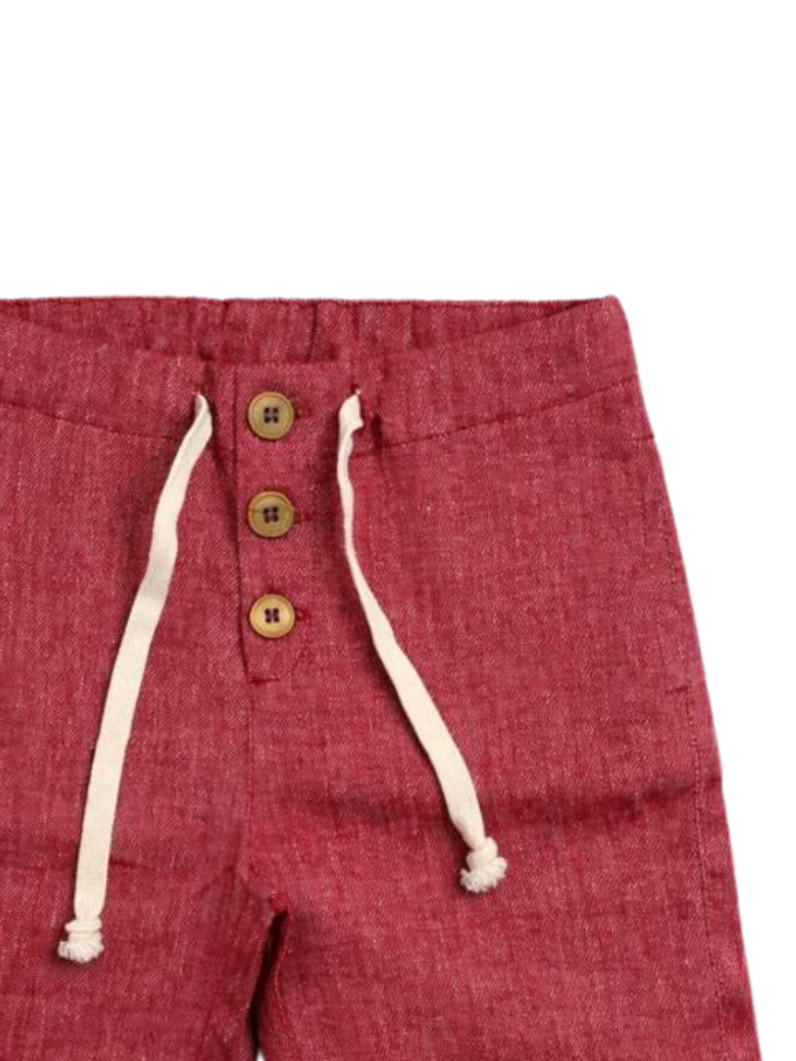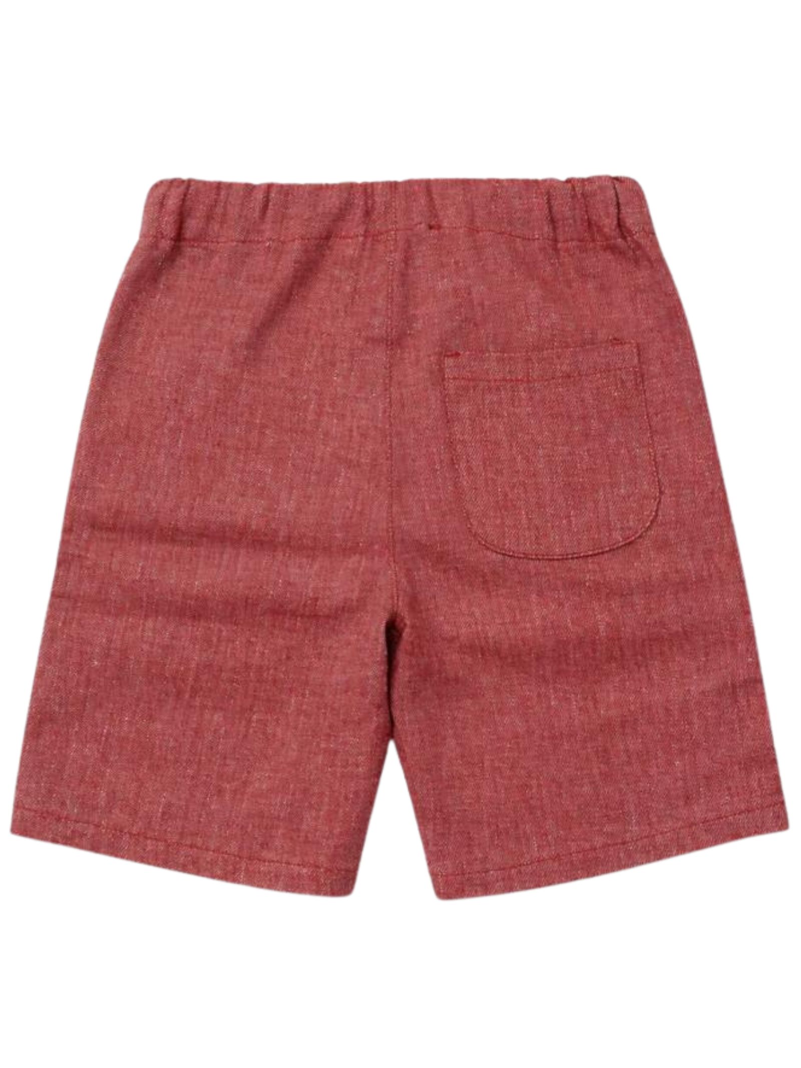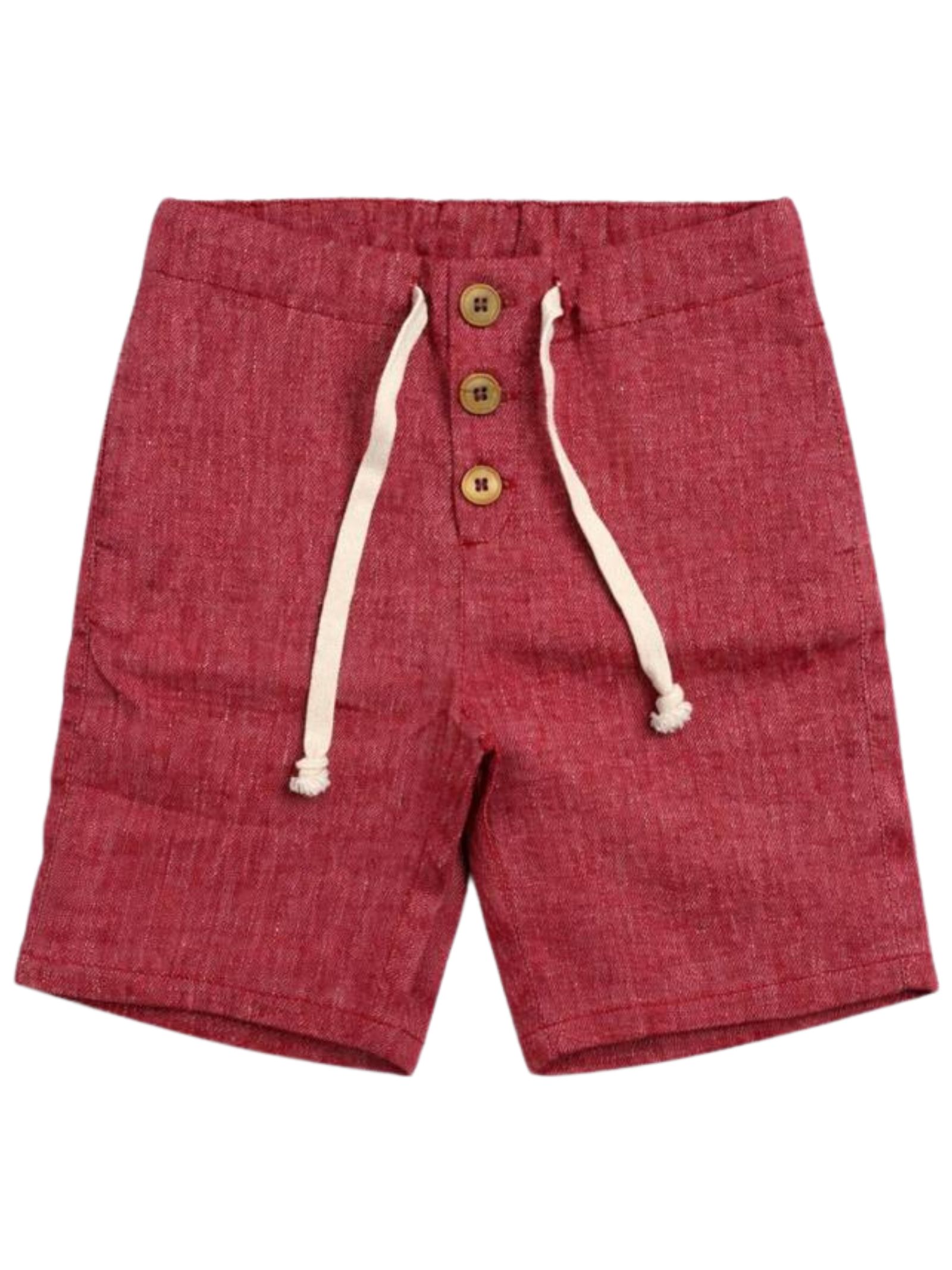 Zhoe & Tobiah Kids bermuda di colore rosso, realizzato in morbido cotone e lino effetto denim, due tasche laterali, vita con coulisse, chiusura frontale con bottoni, vestibilità regolare, taglio dritto. Composizione: 49% Lino 47% cotone 4% elastan. Made in Italy